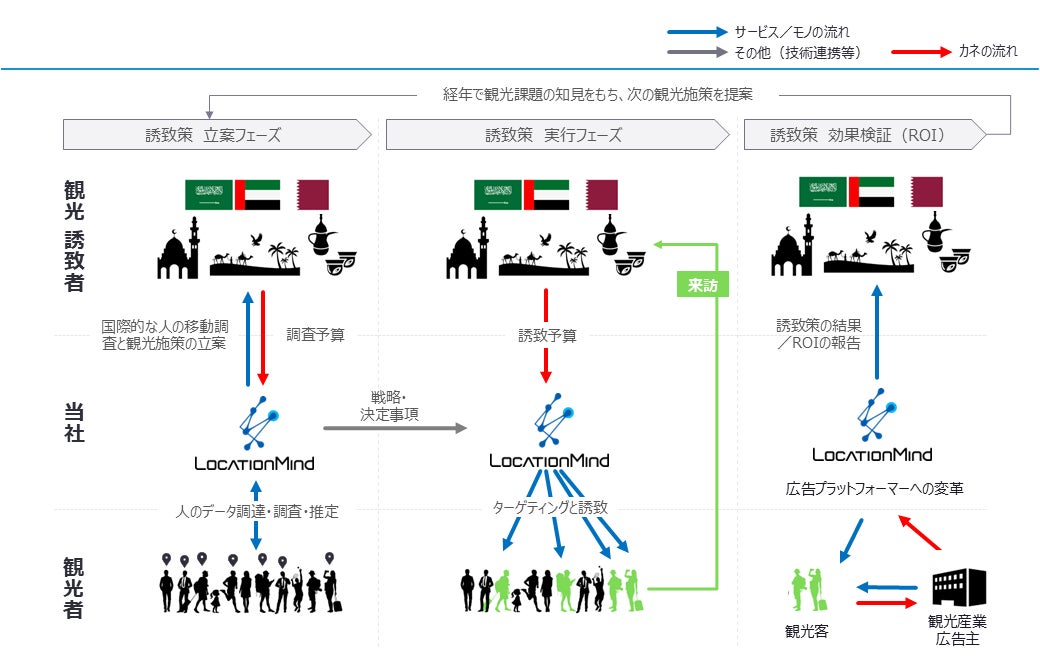LocationMindは『サウジアラビア王国・アラブ首長国連邦・カタール国/グローバルに人の往来を加速させる位置情報AI実証事業』を実施し、対象国でのインバウンド観光人流調査と広告施策、旅ナカ広告の実施と効果検証を行います。