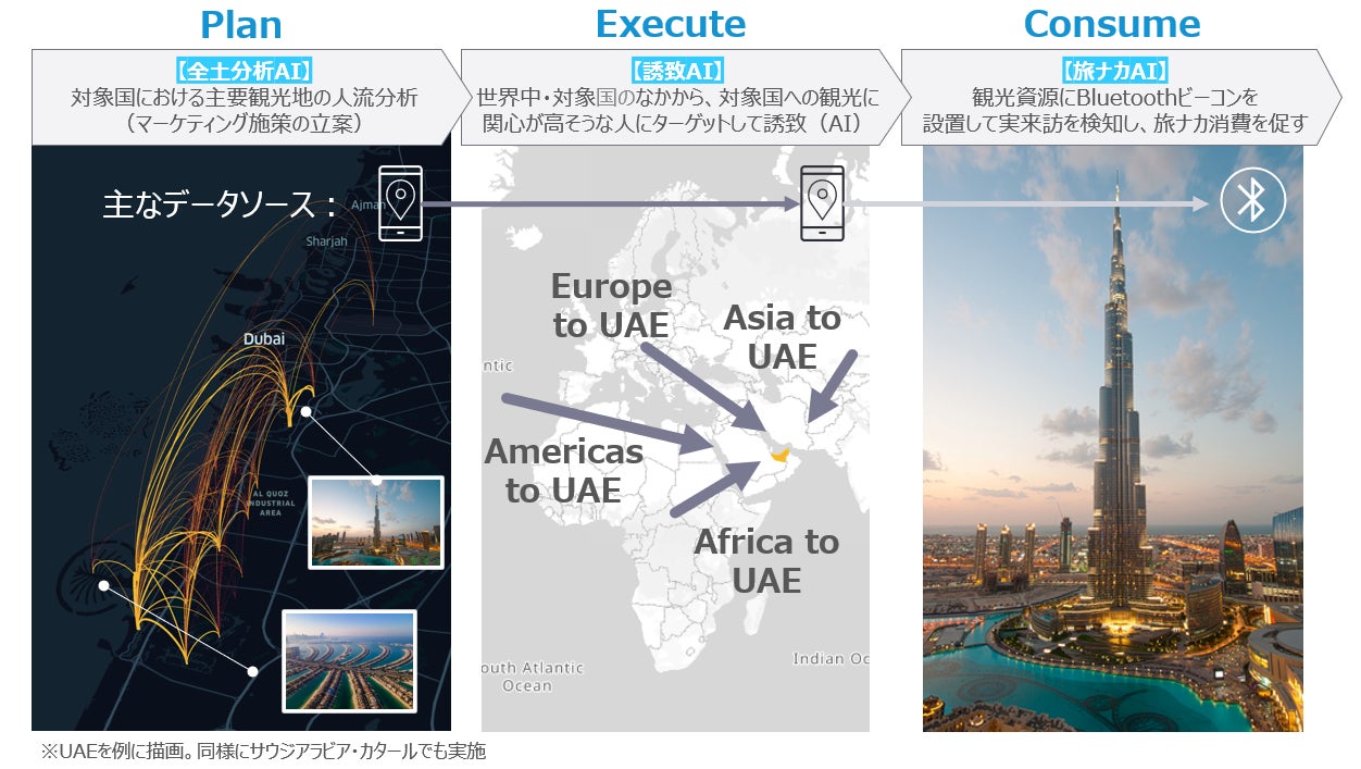 スマートフォンのGPSから得られるグローバルな位置情報ビッグデータを活用し、サウジアラビア王国、アラブ首長国連邦、カタール国の3ヵ国(以下、対象国)にある主要観光地の人の流れを分析します。この分析結果をもとに、効果的なマーケティング施策を立案します。 -