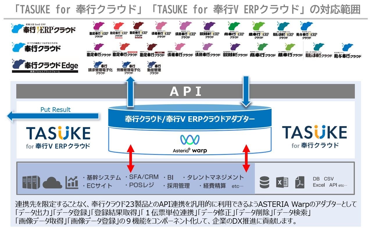 2023年4月より発売を開始した鈴与シンワートの「TASUKE for 奉行クラウド」は、「奉行クラウド」のデータ出力、データ登録、登録結果取得の3機能を提供して参りましたが、今回、1伝票単位連携、データ修正、データ削除、データ検索、画像データ取得、画像データ登録の6機能を加え、9つの機能を有することとなります。また、即戦力型SaaS ERPの「奉行V ERPクラウド」にも完全対応することでこれまで以上に、連携システムや連携項目を限定することなく、「奉行クラウド」「奉行V ERPクラウド」とより汎用的に、より自由にAPI連携を実現することができます。
