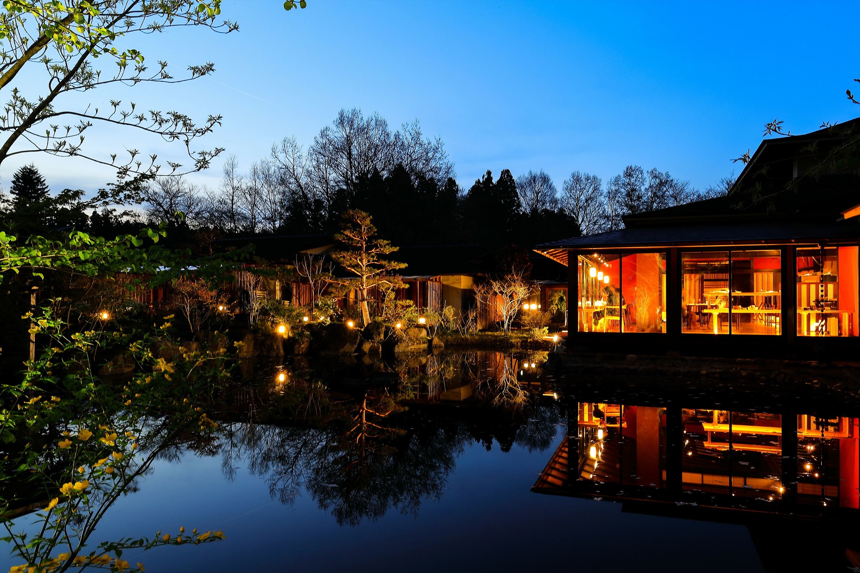 “食事を楽しむ”をコンセプトとした2食1泊付きの宿。2300坪の広大な敷地にある客室はわずか11室。日本宿ならではのおもてなしを実感できる。