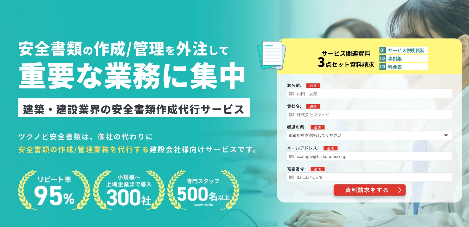 今回ご紹介する『ツクノビ 安全書類』は、こうした考え方に基づき「安全書類・グリーンファイル」に特化してパッケージ化したサービスです。各社のフォーマットや元請・発注者の仕様に合わせて、安全書類の作成から回収・整理や確認までを代行することで、「現場担当者が安全書類に追われ続ける状態」からの脱却と、事務負担の軽減・現場の安全管理レベル向上を同時に支援します。
