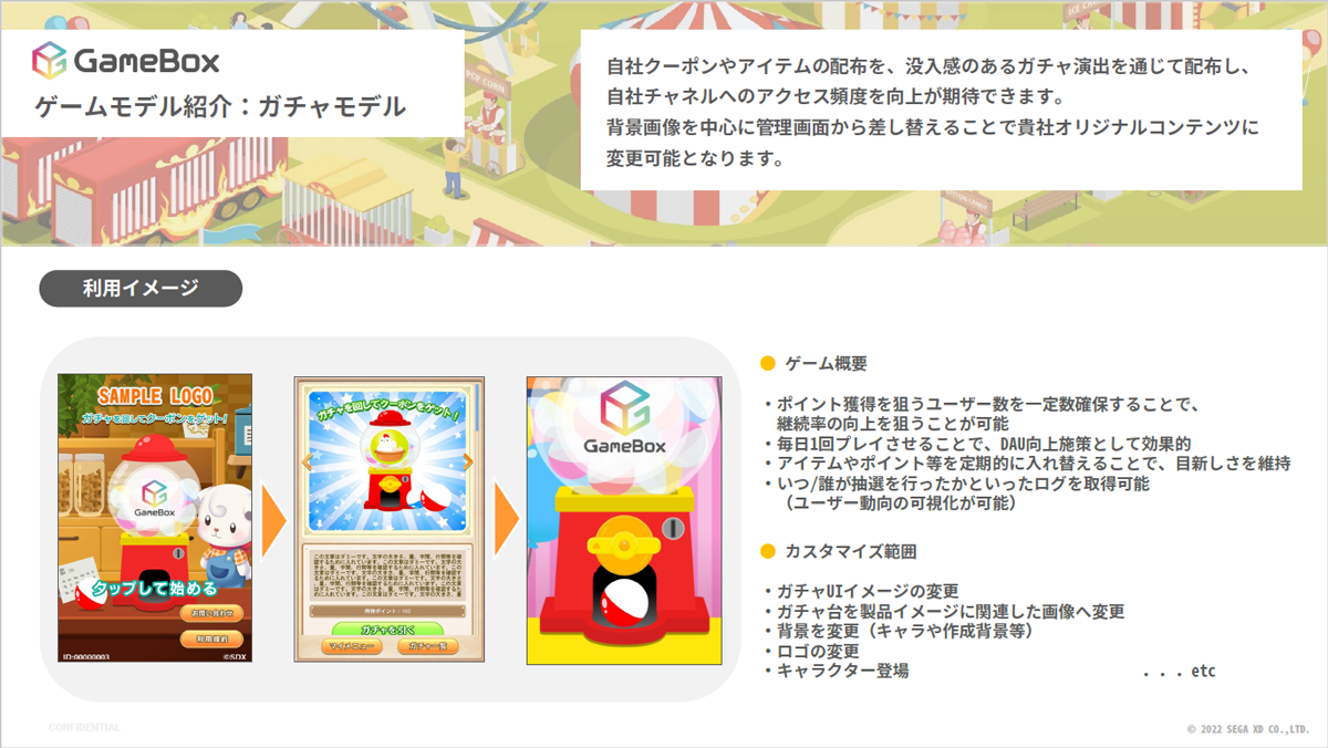 この様な状況から、当社の SaaS 事業で提供しているゲーミフィケーション×CRM SaaS「 GameBox 」(https://game-box.info/)内のゲームエンジンモデルに、抽選部分のみを切り出して体系化し、簡単に各社の世界観や、顧客へのインセンティブの考え方に沿 ったオンラインガチャを様々な、様々なデジタルチャネルに埋め込み、手軽に企業のコンテンツ上で提供して、販促やCRMに活かせることを可能にいたしました。