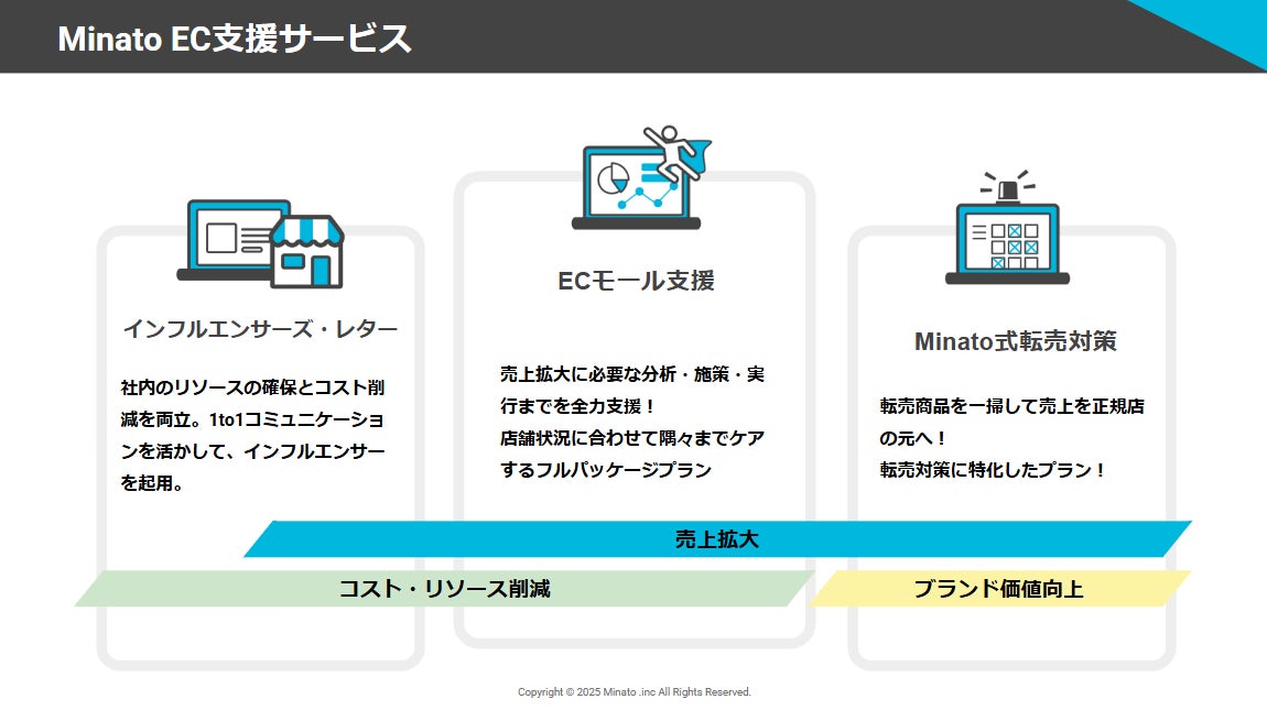 『面白そうな領域になんでも首を突っ込む』をミッションにデジタルマーケティングの力でクライアントの商品を世に広めるデジタルマーケティング支援事業を行っております。ECモールコンサル支援に強みを持ち販促を強化したい企業に対して広告支援や検索対策、転売対策や顧客・市場データの分析など幅広く展開しています。シナジーのある企業との連携を軸にMinato × パートナー企業で新しい価値を生み出します。