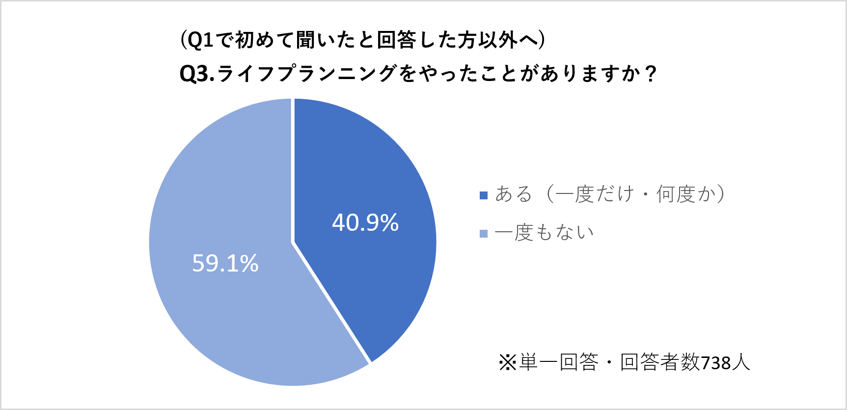 また、「ライフプランニングをやったことがあるかどうか教えてください」と質問をしたところ、「一度もない」と答えた人が59.1%となり、約6割の方が未経験ということが明らかになりました。