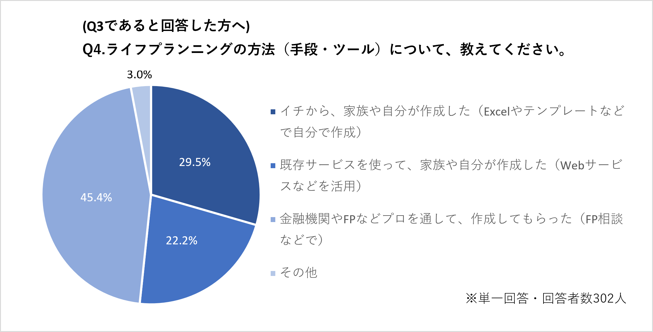 「(Q3であると回答された方へ)ライフプランニングの方法(手段・ツール)について、教えてください。」と質問をしたところ、最多の回答が「金融機関やFPなどプロを通じて作成してもらった」45.4%、次いで「イチから、家族や自分が作成した」29.5%、「既存サービスを使って、家族や自分が作成した」22.2%の順となりました。