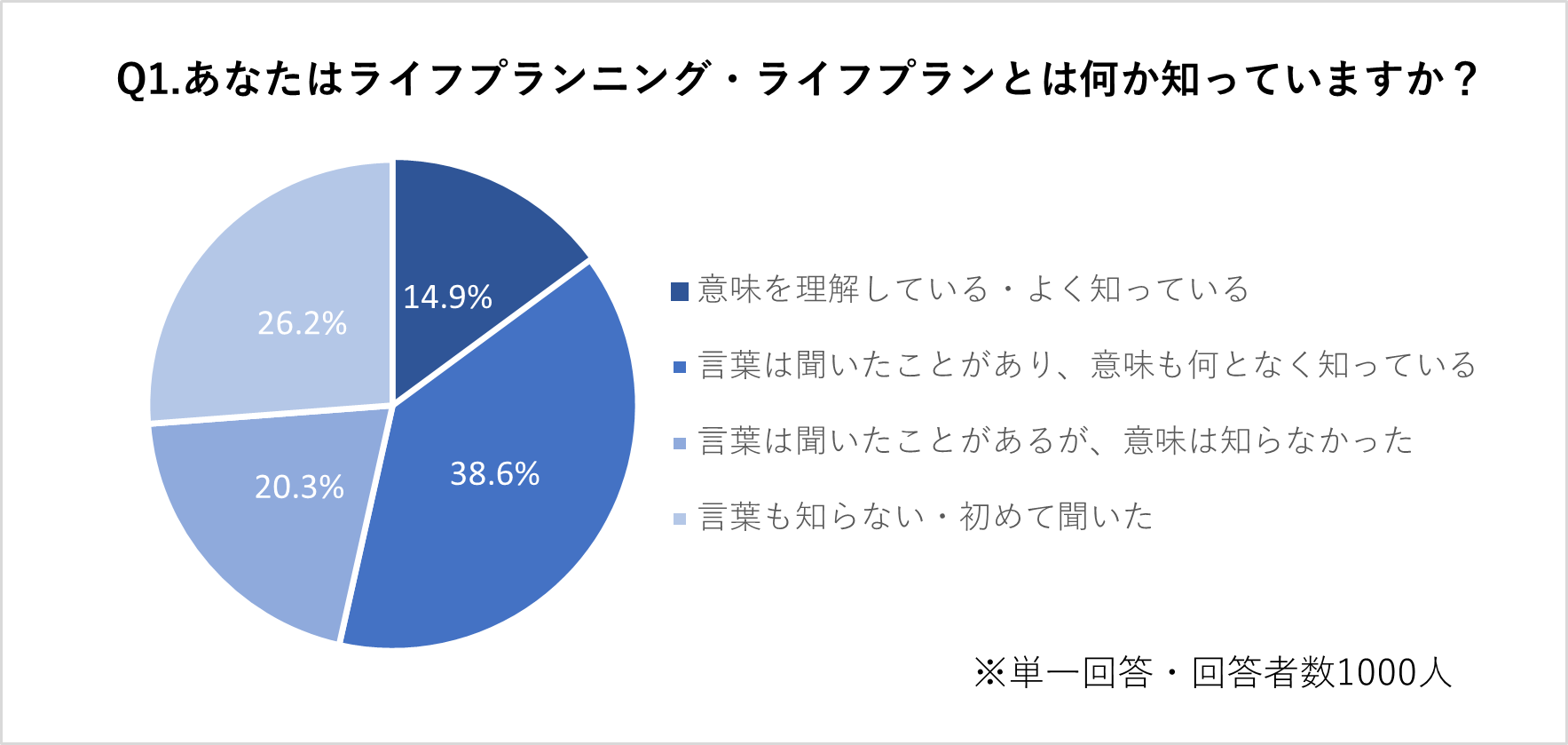 「あなたはライフプランニング・ライフプラン※とは何か、知っていますか?」と質問をしたところ、「意味を理解している・よく知っている」14.9%、「言葉は聞いたことがあり、意味も何となく知っている」38.6%と回答し、意味を何となく知っている人を含めると53.5%となり、2人に1人はライフプランニングについて知っている結果となりました。