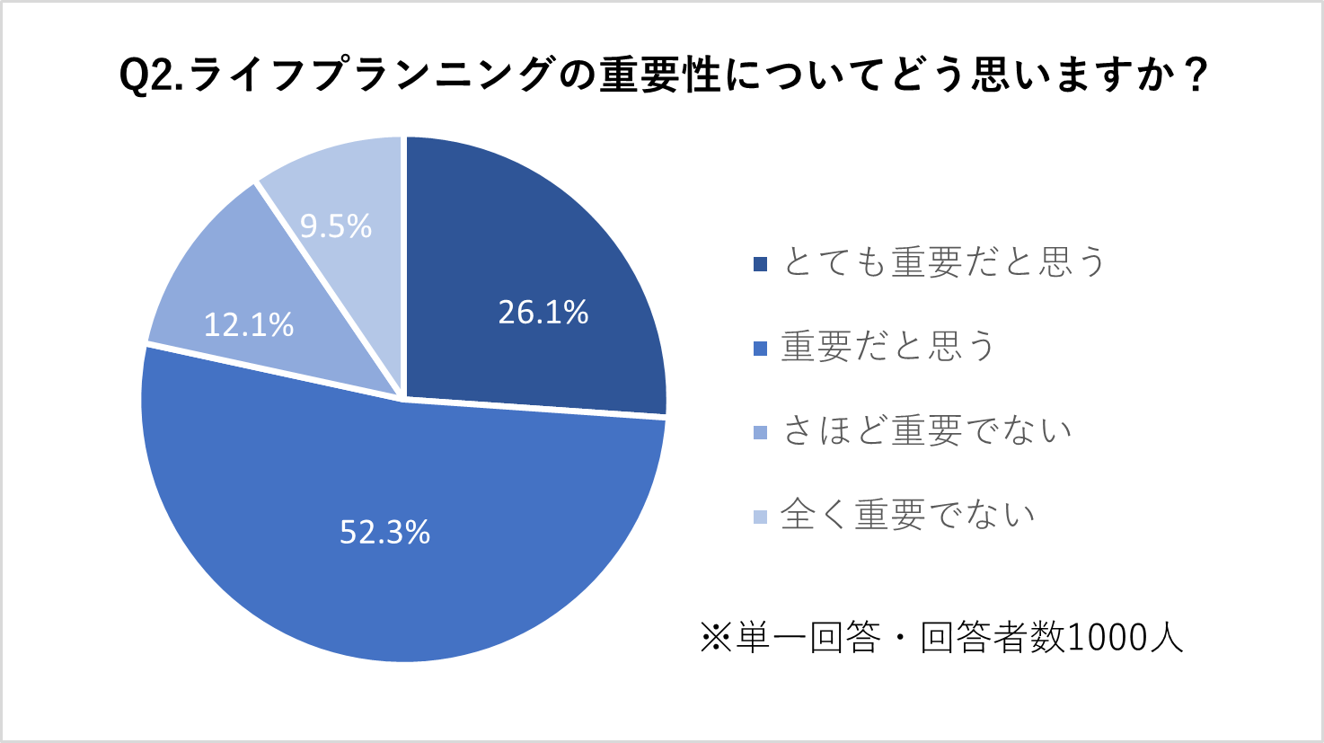 「ライフプランニング・ライフプランの重要性について、どう思いますか?」と質問をしたところ、「とても重要」26.1%、「重要」52.3%と回答しました。合計すると78.4%の人がライフプランニングは重要だと考えていることが分かりました。