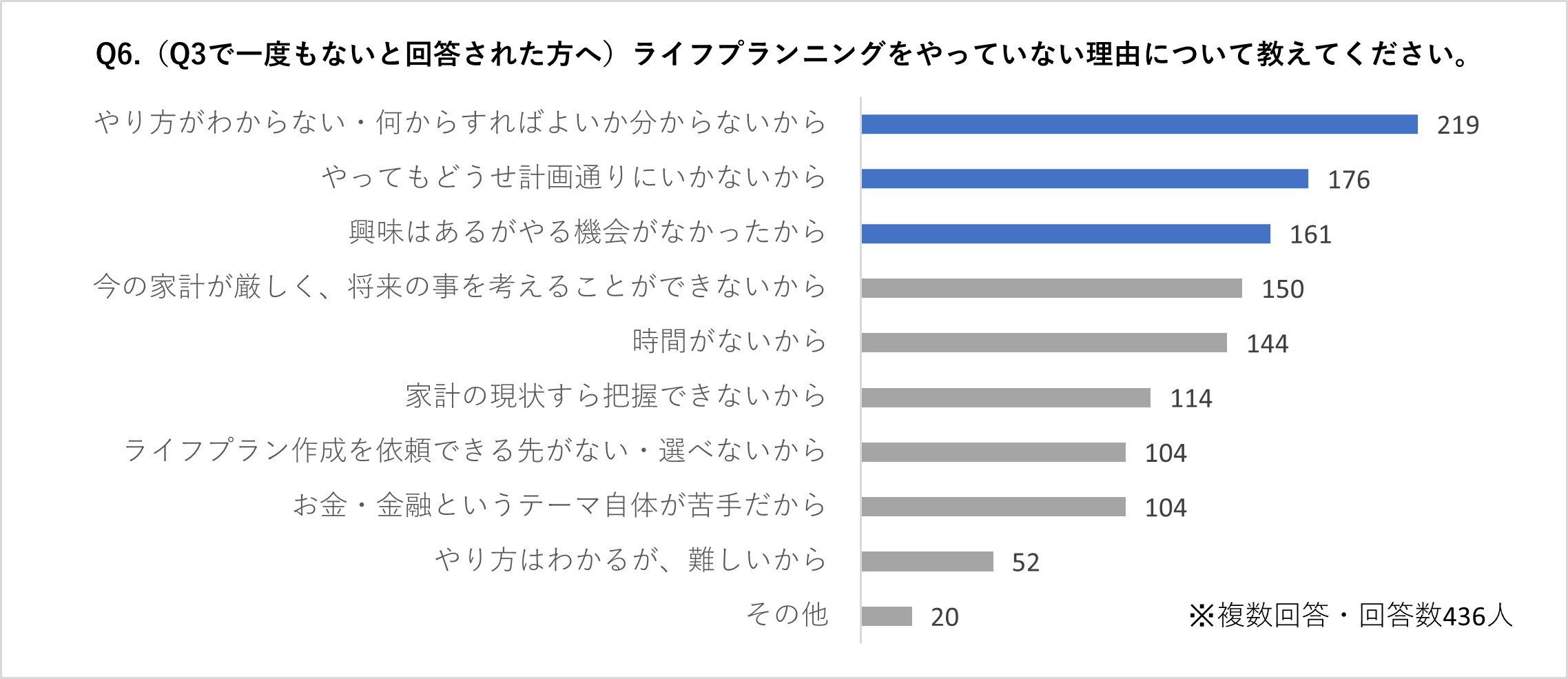 「(Q3で一度もないと回答された方へ)ライフプランニングをやっていない理由について教えてください」と質問をしたところ、1位から順に「やり方が分からない・何からすればよいか分からないから」、「やってもどうせ計画通りにならないから」、「興味はあるが、やる機会がなかったから」という結果となり、正しい(意味のある)ライフプランニングのやり方が分からない方が多いと考えられます。