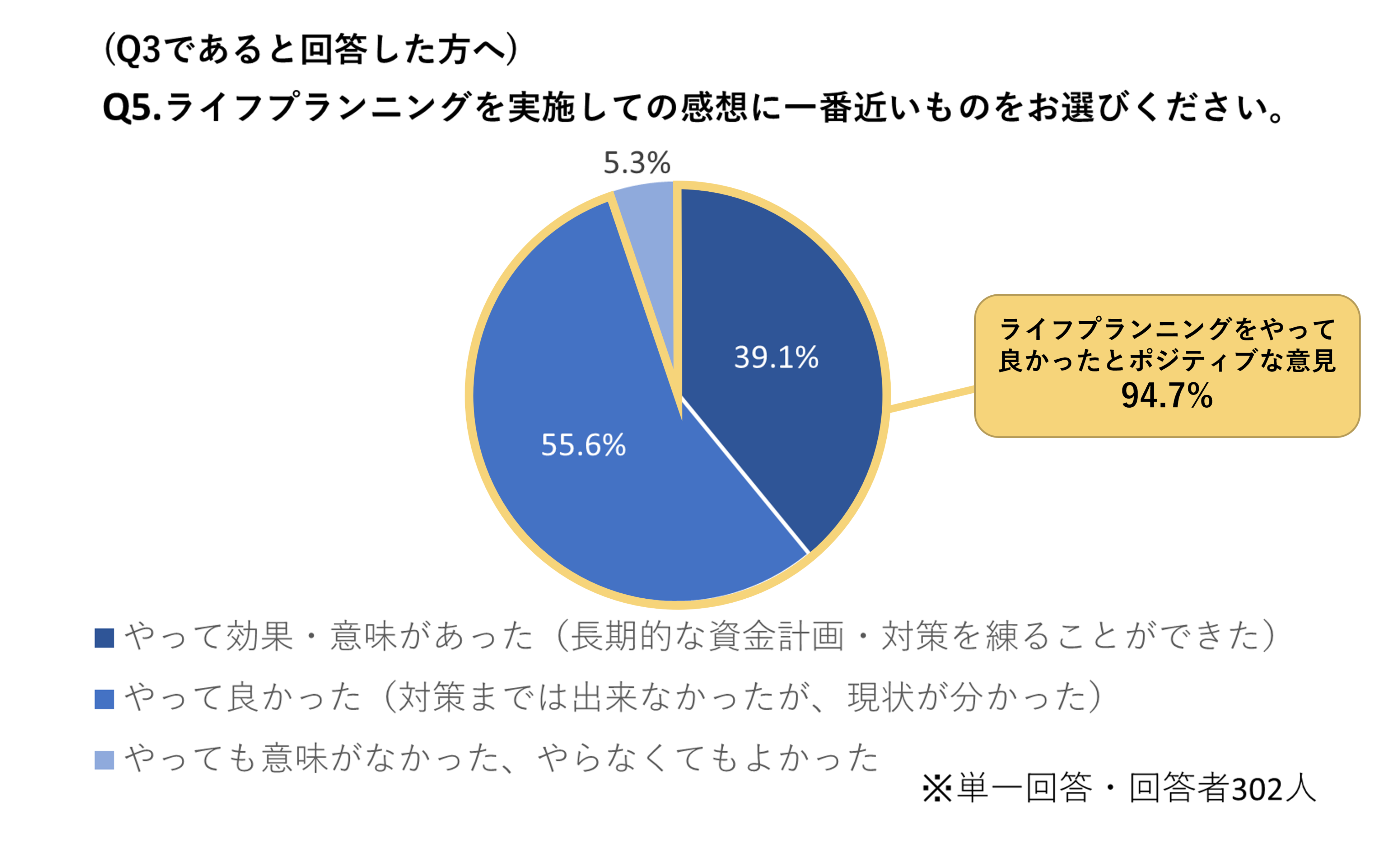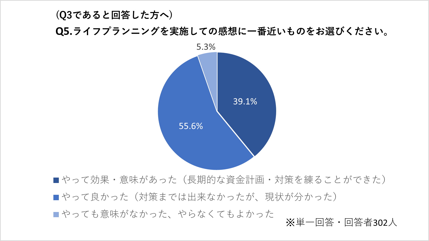 「(Q3であると回答された方へ)ライフプランニングを実施しての感想に一番近いものをお選びください。」と質問をしたところ、「やって効果・意味があった(長期的な資金計画・対策を練ることができた)」39.1%、「やって良かった(対策まではできなかったが、現状が分かった)」55.6%と回答しており、94.7%の人がライフプランニングを実施して良かったとポジティブな意見が多い結果となりました。