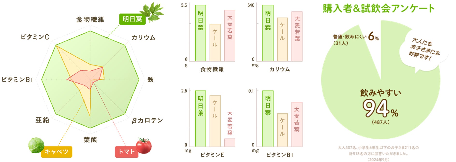 ●有名な青汁素材と比べても、明日葉の栄養価の高さはばつぐん。ケールはビタミンC、大麦若葉は鉄など得意分野はあるものの、明日葉は栄養の総合力に優れている