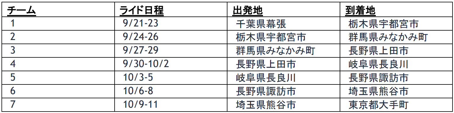 C2C4Cは、がんで亡くなった人や現在闘病中の患者さんを想いながら、世界中の有志の社員が自転車で走行するチャリティ活動で、2014年に米国で始まり、今年で10周年を迎えます。日本では2021年にスタートし、開催3回目となる今年は9月21日から10月11日まで、約70名の社員ライダーが7つのチームに分かれて、千葉県・幕張から東京・大手町までの約2,100キロをリレー形式で走り抜きます。