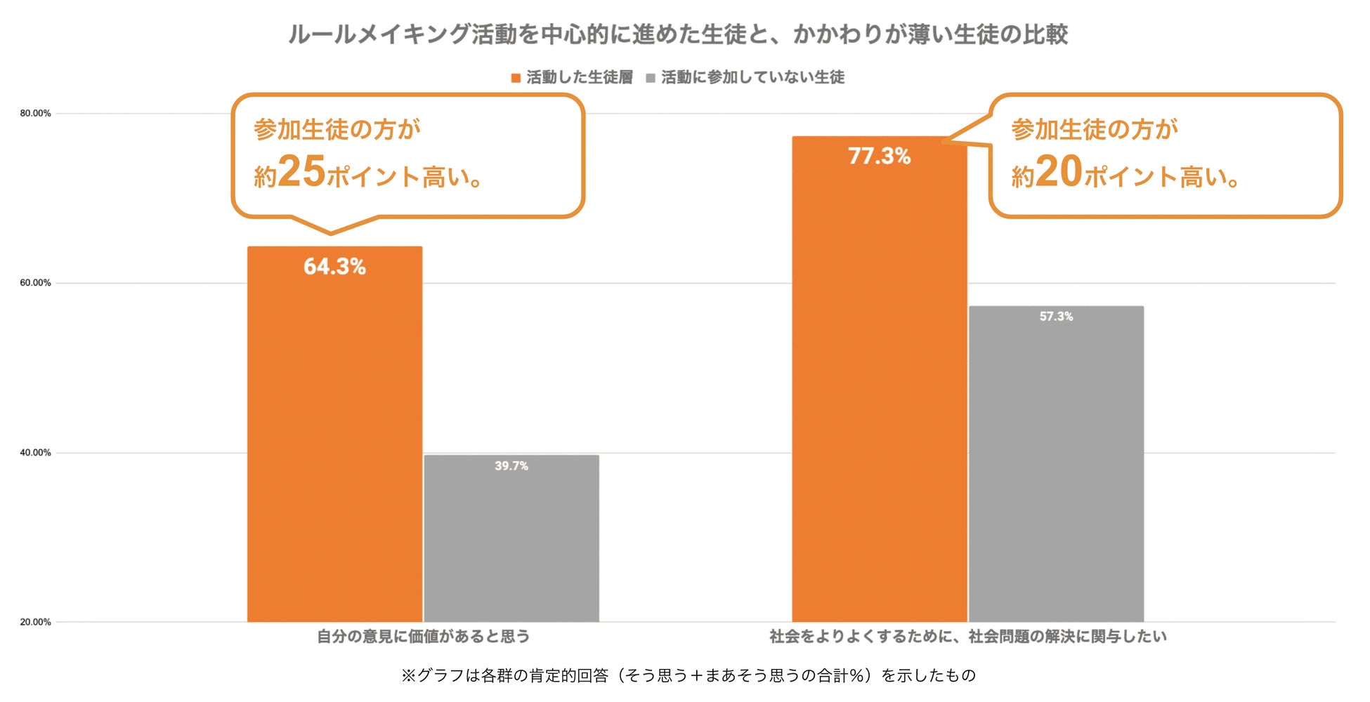 その結果「自分の意見に価値があると思う」という設問に対し、活動に取り組んだ生徒は、取り組まなかった生徒と比べて約25ポイント高いという結果になりました。