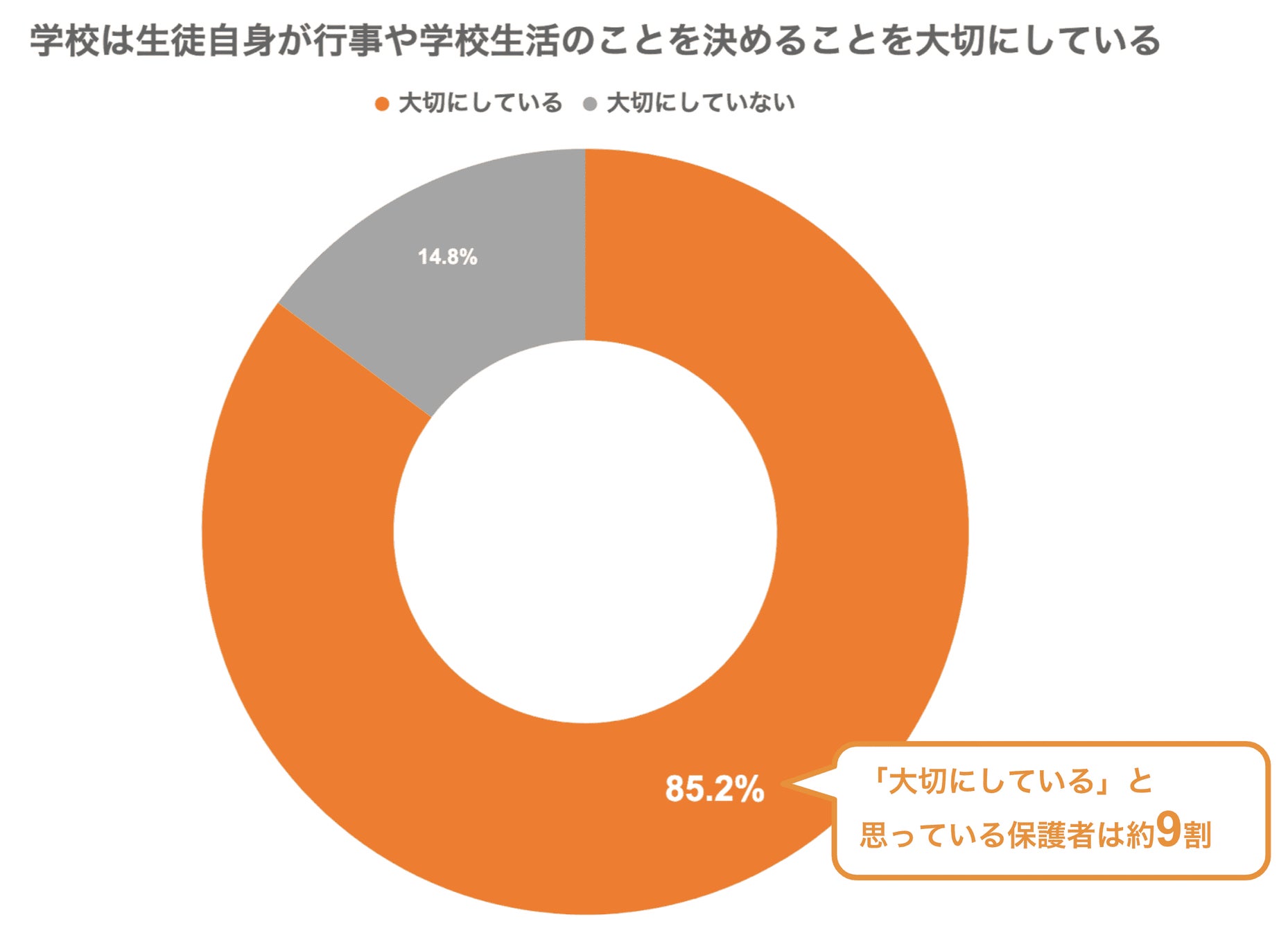 「学校は生徒自身が行事や学校生活のことを決めることを大切にしている」という設問に対して、85.2%の保護者が「大切にしている」と回答しました。