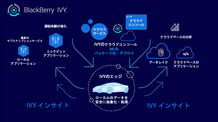 BlackBerry IVY は、消費者のセキュリティやプライバシーを損なわずに、自動車メーカーが車内でのオンライン決済、バッテリー管理、ブレーキやタイヤの摩耗の予測メンテナンスなど、ドライバーと乗客の車内エクスペリエンスを向上させる革新的なアプリケーションを迅速に導入できるよう設計されています。
