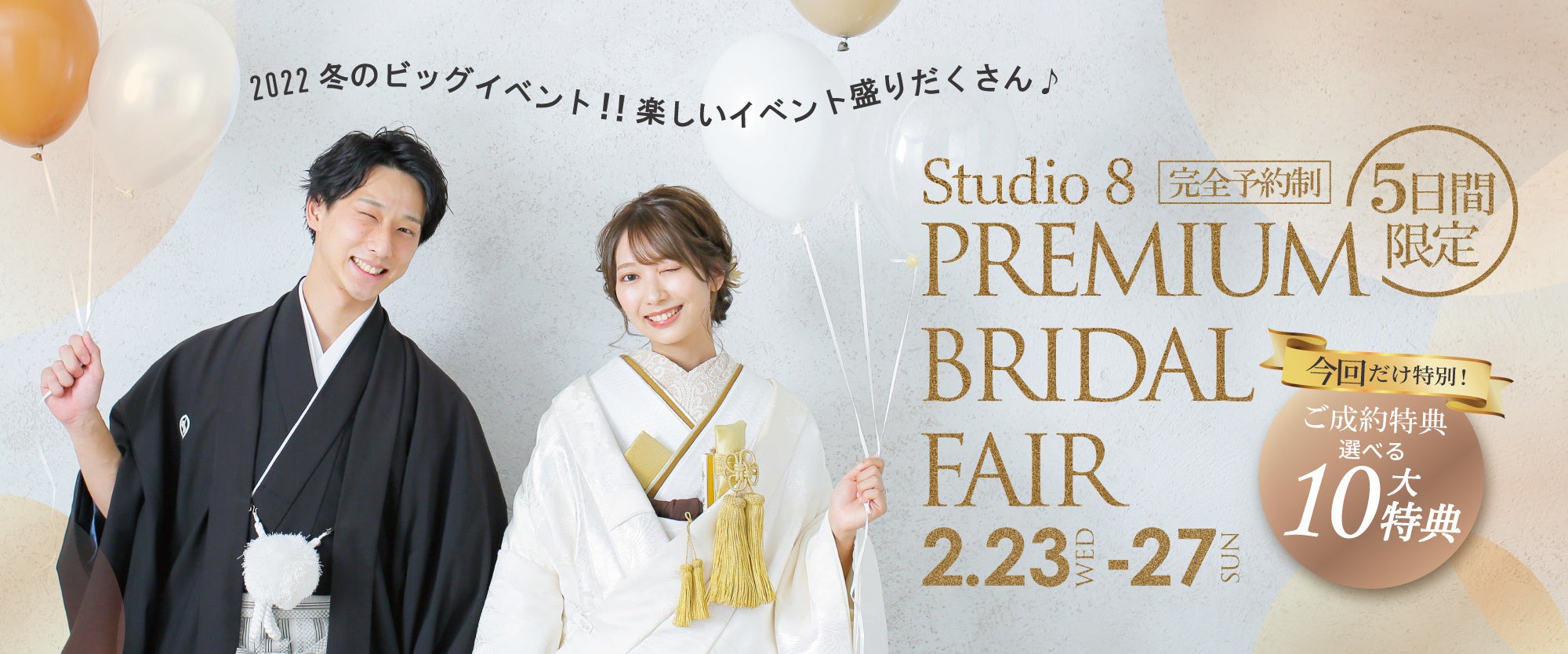 株式会社デコルテ(本社:兵庫県芦屋市、以下デコルテ)が運営するウェディングフォトスタジオ「スタジオ8(スタジオエイト、愛知県名古屋市)」では、2022年2月23日(水)~2月27日(日)までの期間限定で『スタジオ8 PREMIUMブライダルフェア』を開催いたします。