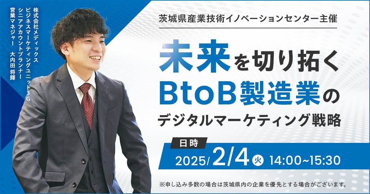 株式会社メディックス(本社:東京都千代田区、代表取締役社長:田中正則、以下「当社」)は、茨城県産業技術イノベーションセンター(以下「同センター」)主催の『未来を切り開くBtoB製造業のデジタルマーケティング戦略』セミナーにおいて、当社社員が登壇することをお知らせいたします。同センターは、企業のイノベーション創出促進や開発力・提案力・スピードを持った企業育成のために、先導的研究の推進やビジネス創出支援および技術課題解決や企業人材育成を進めることで、県内産業の発展に貢献しています。
