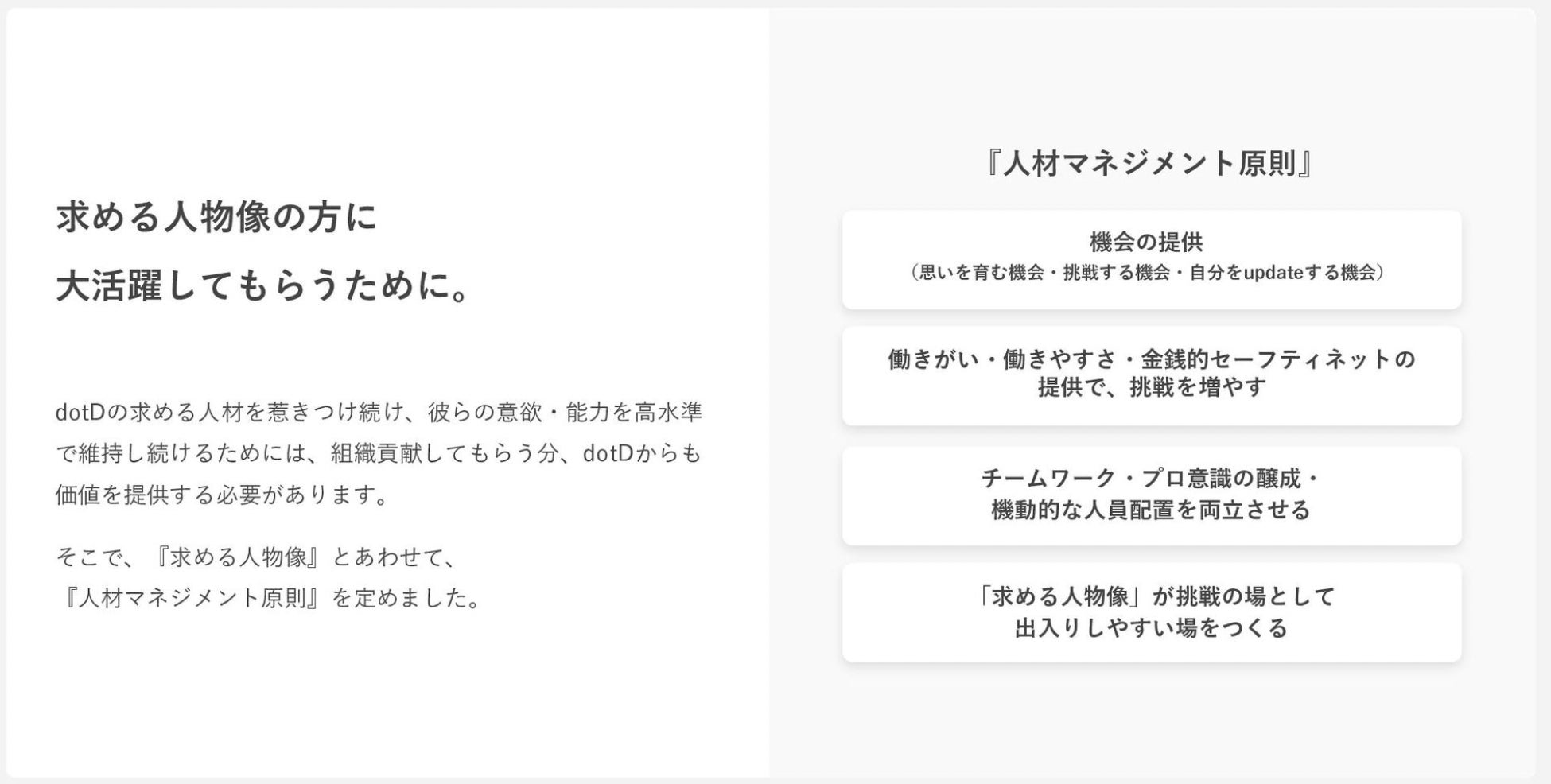 会社へ貢献してもらう対価としてdotDからも価値を提供する必要があると考えており、dotDでは「人材マネジメント原則」を定めています。全社員へ「機会の提供」「働きがい・働きやすさ・金銭的セーフティーネットの提供」など社員の意欲・能力を高水準で維持し続けてもらうことで、より活躍してもらうための環境づくりを心がけています。