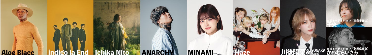 Aloe Blacc、そしてニューアルバム『哀愁演劇』が同週にリリースされるindigo la End、十代を代表するインフルエンサーでありデビューシングル『繋いだ手』が TikTokで2億回以上再生され歌手としても大活躍しているMINAMI、香椎かてぃ率いるロックバンドHaze、乃木坂46 一期生であり先日LAND MUSIC / WARNER MUSIC JAPAN より『ふたつの影』をリリースしたばかりの川後陽菜 &YONAKA Band、10月20日にLAND MUSICより初のEP をリリースした日本を代表するラッパーANARCHY、 自身のYouTube 登録者は250万人を超えイギリスのギター雑誌「Total Guitar」の読者が選ぶ「史上最高のギタリスト100選」で「現在最高のギタリスト」として8位にランクイン。世界が注目するギタリストIchika Nito、そして見事オーディションで勝ち残った新潟県出身かわむらいさみ、三条在住シンガーソングライター千央と盛り沢山な内容になっている。