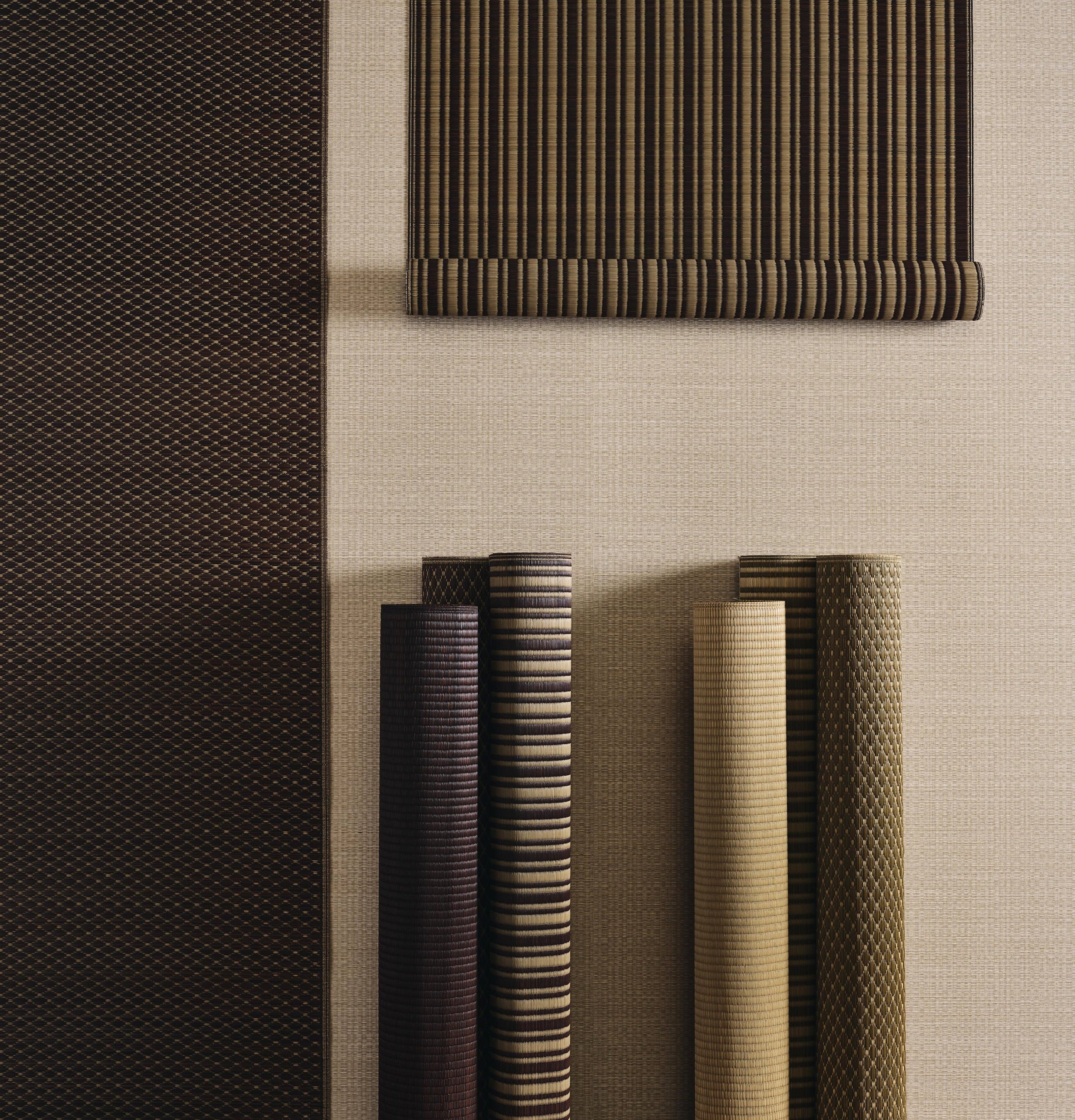 新しい壁紙は、ラフィア、ジュート、ウールの断熱性、防湿性、耐久性を組み合わせ、非常に洗練されたインテリアアイテムへと仕上げられました。ラフィアとジュートの不規則で魅力的な特性が、幾何学的なプリントに独特の質感と個性を添えています。サイザル・ラフィアとコットンを組み合わせた壁紙は、無地、ストライプ、モアレ模様、小さなダイヤモンド模様(アストラット、アストラット・ストライプ、モアレ、ダイヤモンド)の4種類です。これらの製品はすべて織機で織られ、特殊な下地に接着されて壁面に貼られます。洗練された都会的な印象を与える様々なモチーフは、無地と組み合わせて使うことができます。