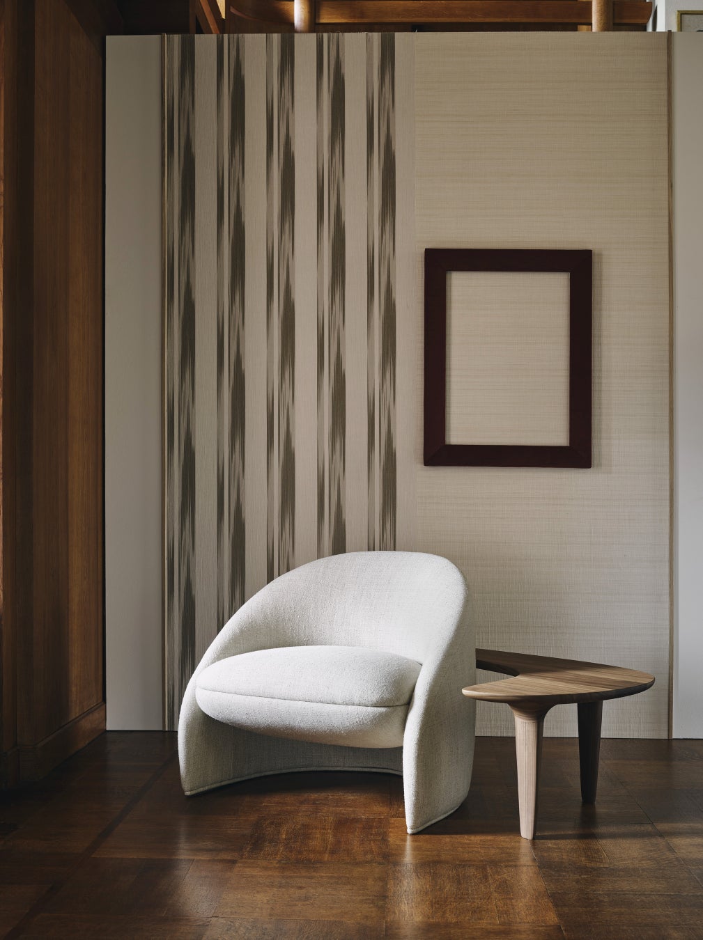 ロロ・ピアーナ・インテリアは、ジュートとコットンの特殊なブレンドをジャカード織りの壁紙として開発しました。この生地は、プリントされたジュート糸を使用して、意図的に不規則な色彩効果を生み出しています。