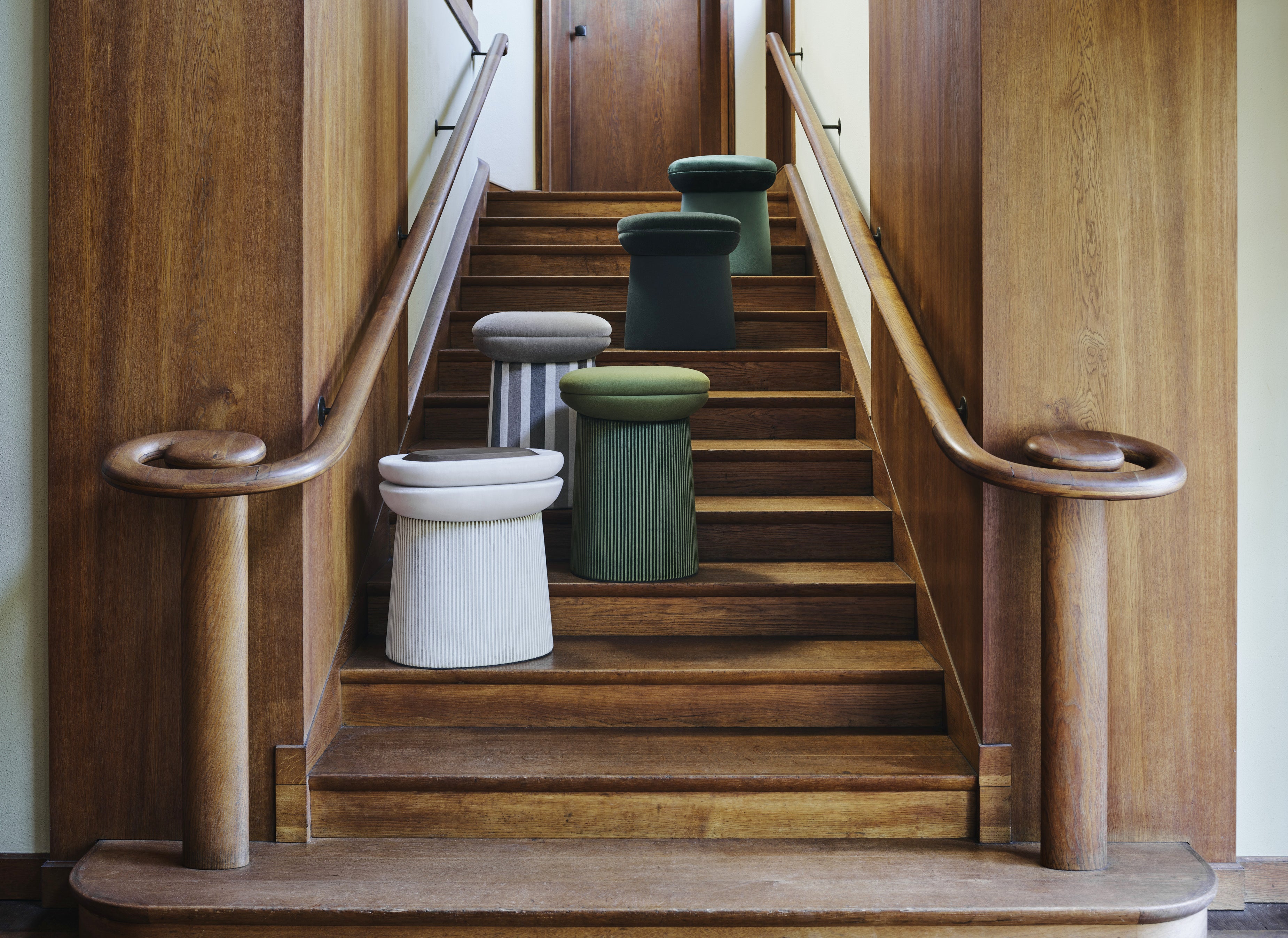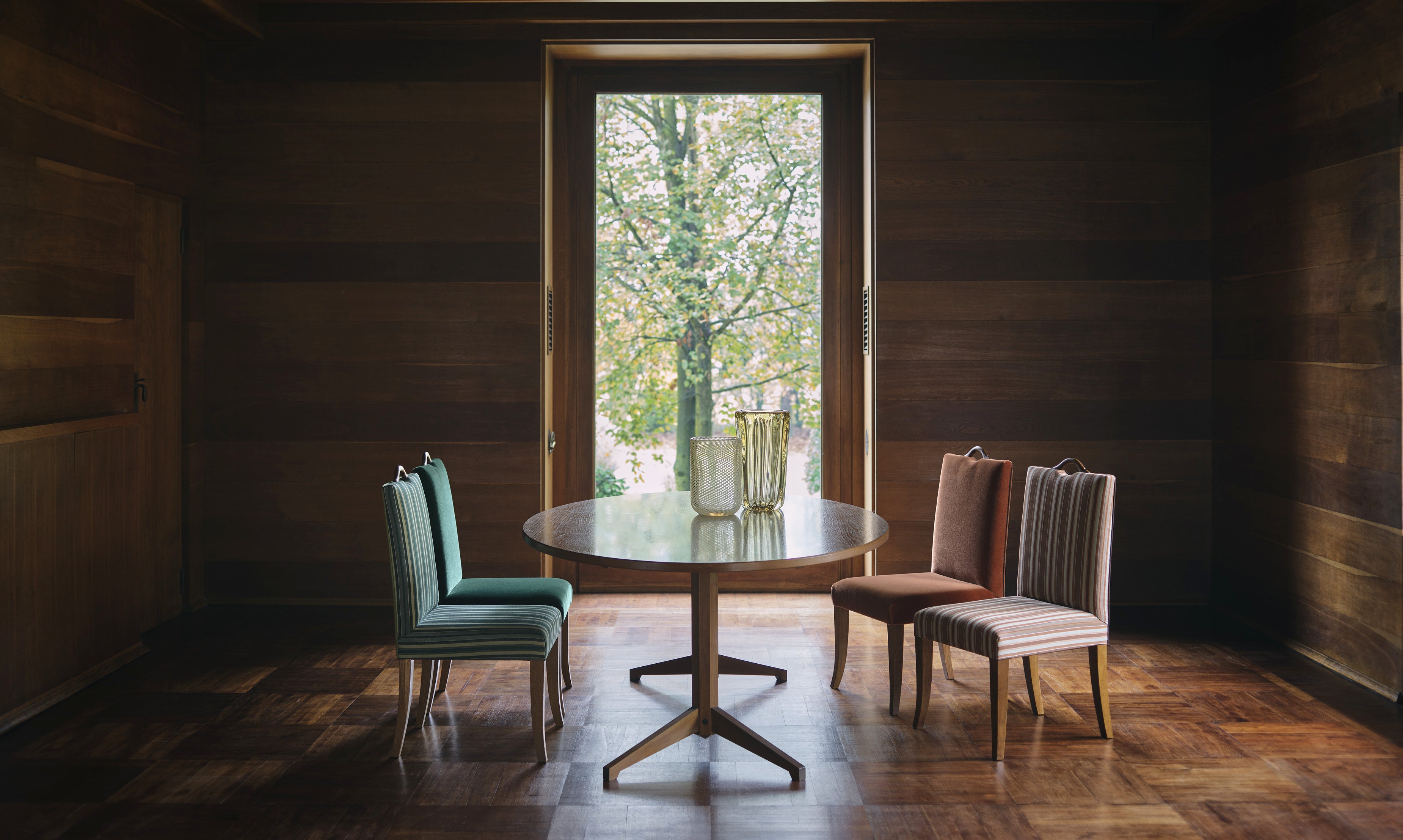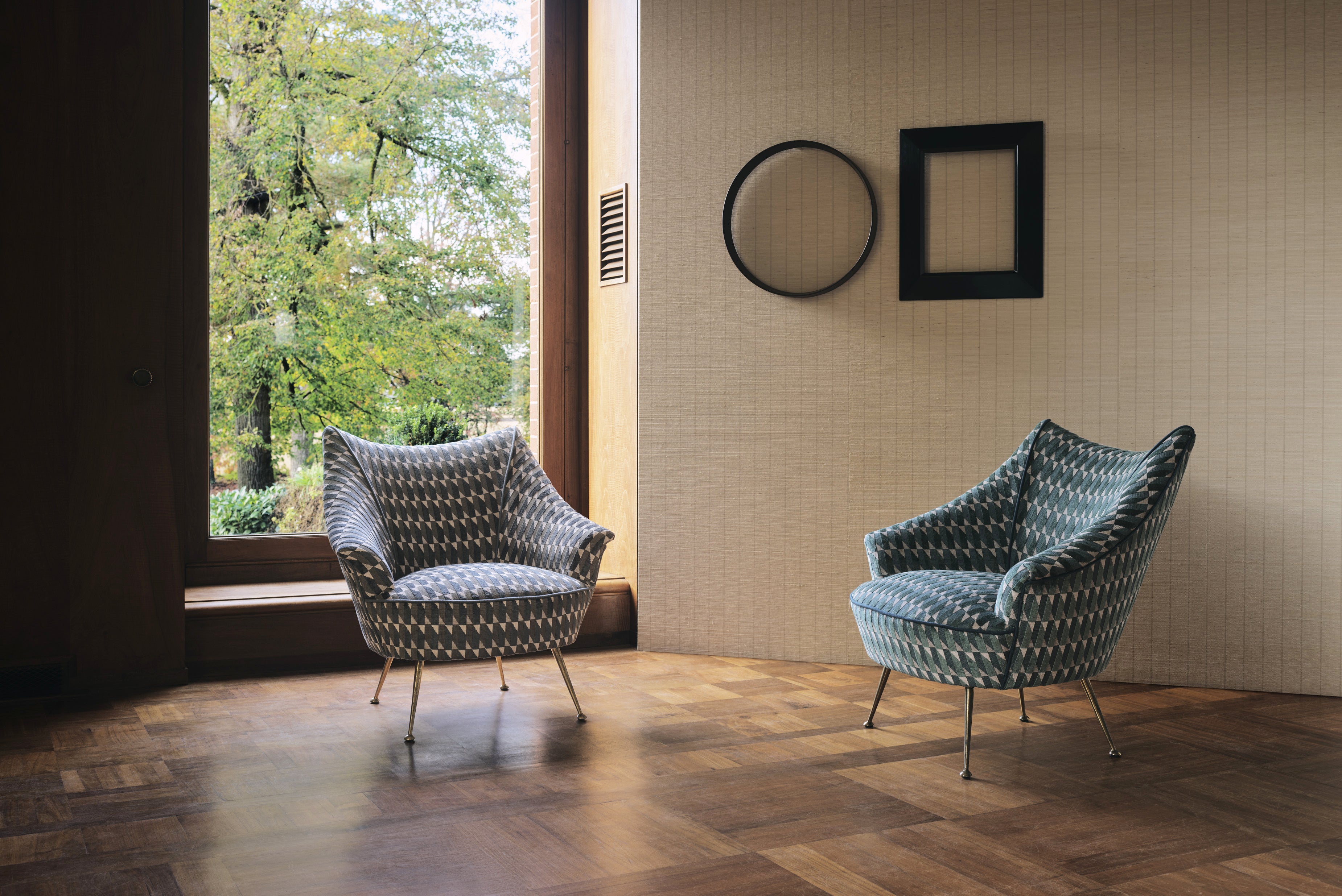 2023年のコレクションの生地は、光沢のある鮮やかな色合いで、シルクが独特の輝きを放ちます。また、無地や柄物のベルベットも豊富に取り揃えています。幾何学的デザインをテーマとし、20世紀半ばのファッションに見られるモチーフに倣い、ファブリック、壁紙の両方にダイヤモンドとストライプがあしらわれています。イグサの特性を生かした幾何学模様と対称性も特徴です。