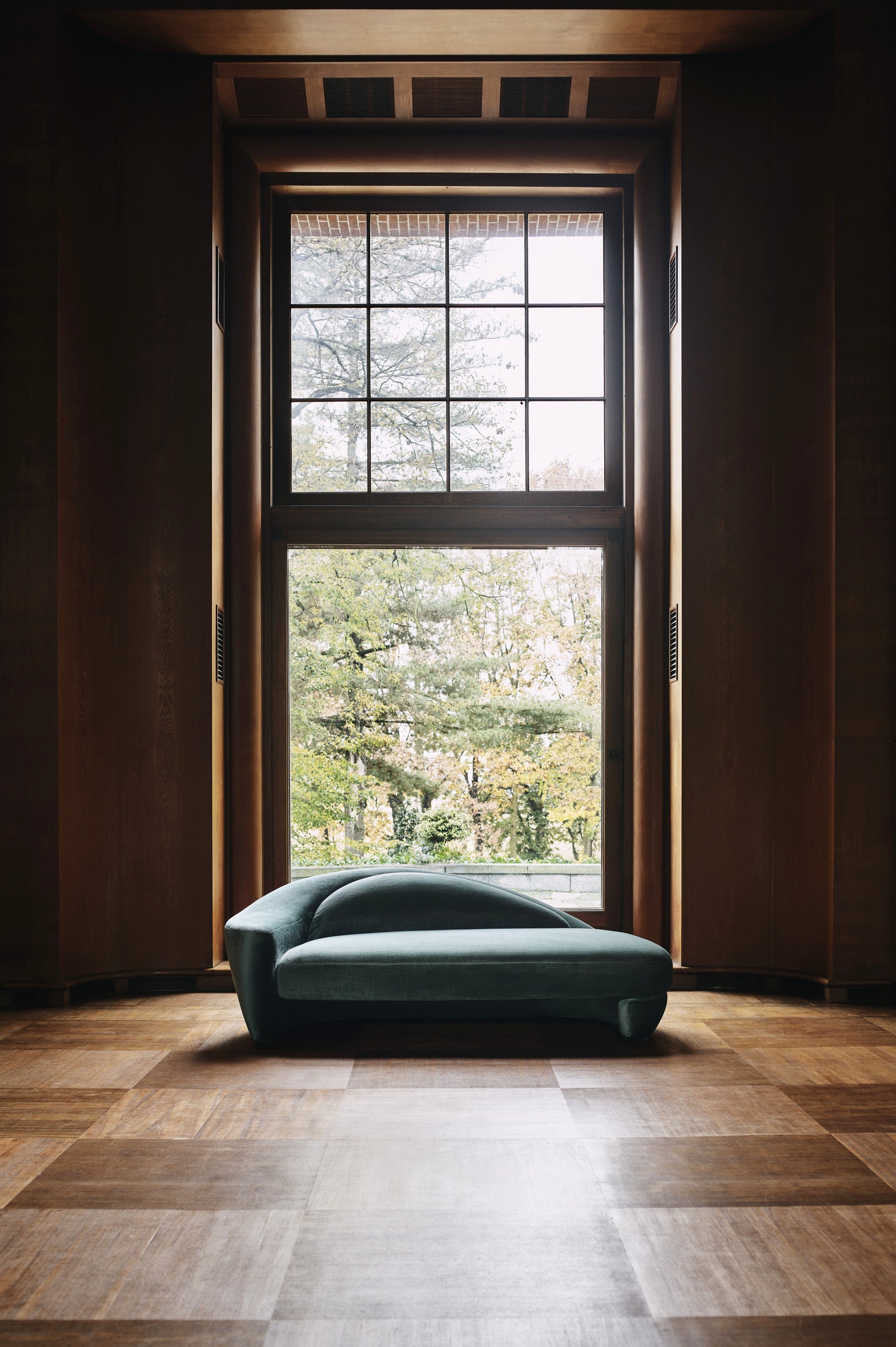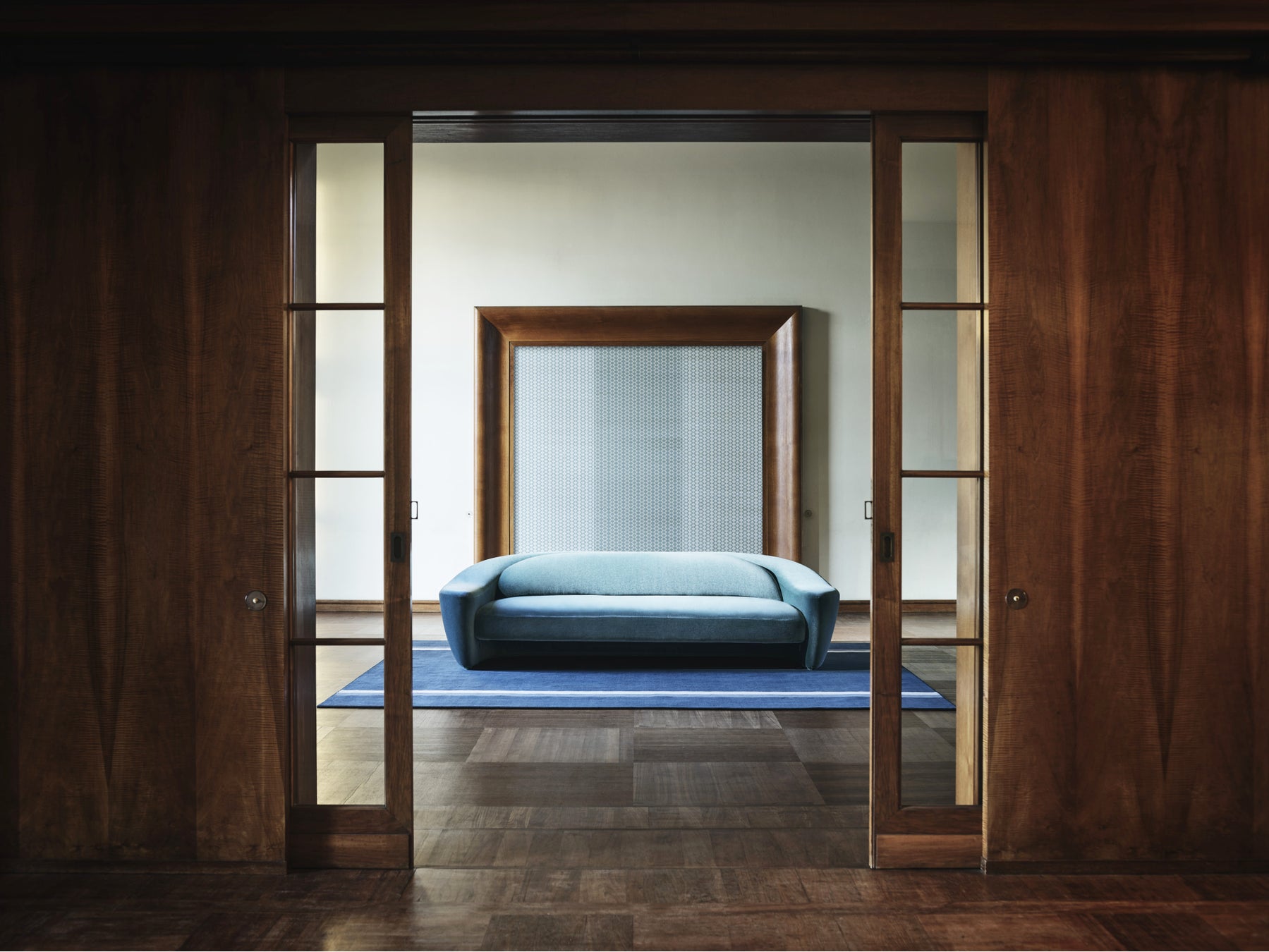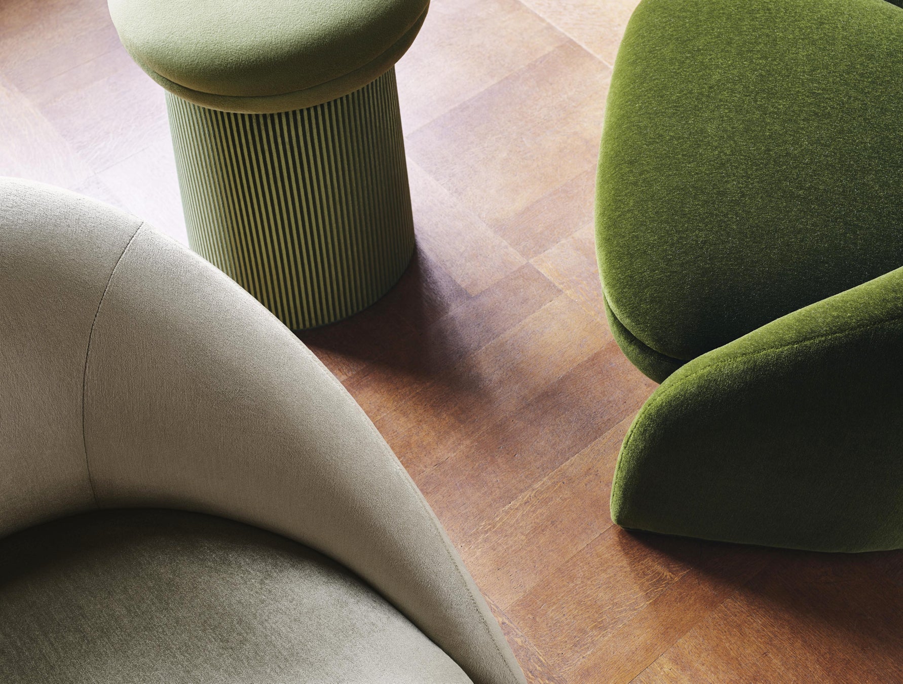 新作ボールルームは、20色展開のモヘア・ベルベット。美しい質感で、シワになりにくく、汎用性の高い素材です。サロンも新しいシルク・ベルベットで、意図的にフルボディにすることで弾力性を持たせています。パーラーとギャラリーはコットン素材のベルベットで、鮮やかな色合いのストライプや幾何学模様が浮き上がり、質感や光の効果で遊んでいるようです。ライブラリーは、幾何学模様のジャカード・ベルベットです。