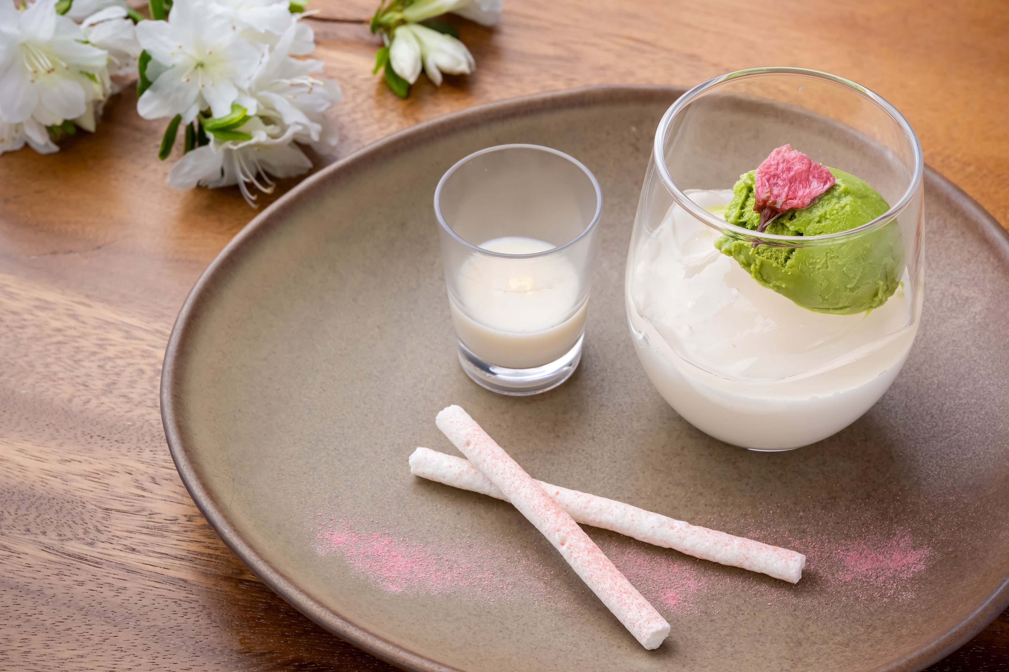 甘酒のソースをかけて食べるデザート「桜ベリーニ 甘酒ソース」。アクセントに桜のメレンゲスティックを砕いて一緒にお召し上がりください。