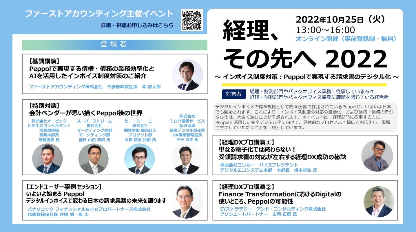 ファーストアカウンティング株式会社(本社:東京都港区、代表取締役社長:森 啓太郎、以下「ファーストアカウンティング」)は、 経理・財務部門やバックオフィス業務に従事している方々と経営者の方を対象に、「経理、その先へ2022 ~インボイス制度対策:Peppolで実現する請求書のデジタル化~」を 10月25日(火)にオンラインで開催いたします。