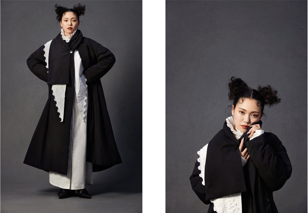 「アニマルフリーなファッションには、もっとデザインの幅が出てきていいのではないか」と前々から課題に感じていた二階堂氏。従来、動物や自然環境に配慮した素材でものづくりを行う際、耐久性が弱くなったり、デザインに制限があったりと、結果的にサステナブル=シンプルという印象が根付いています。本コラボでは、耐久性や機能性も兼ね備え、遊びごころのあるデザインで環境負荷の低い新しい形のモードファッションを目指し、アニマルフリー素材を用いたアウターをデザインしました。