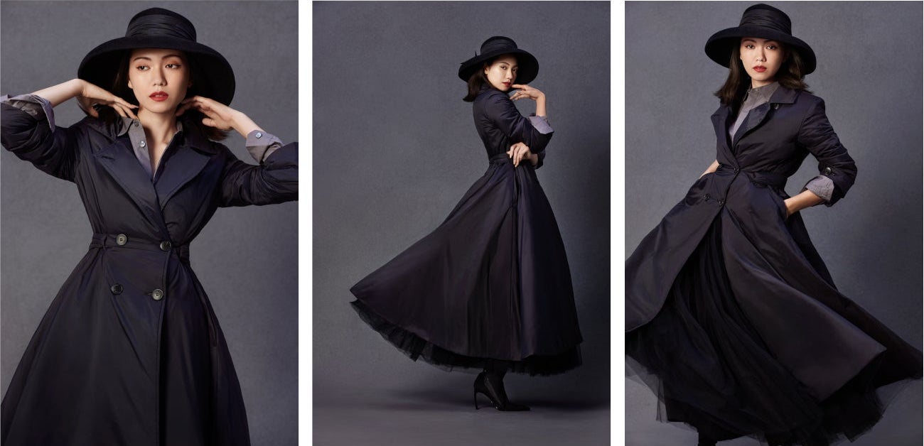 トレンチコートとフレアスカートがミックスしたドレスコート。ダウンの暖かさを持ちながら、薄くて軽くドレスの上に羽織っても着膨れせずにスタイリッシュに着こなせるので、ドレスコードのアウターとしても着用できる一着です。