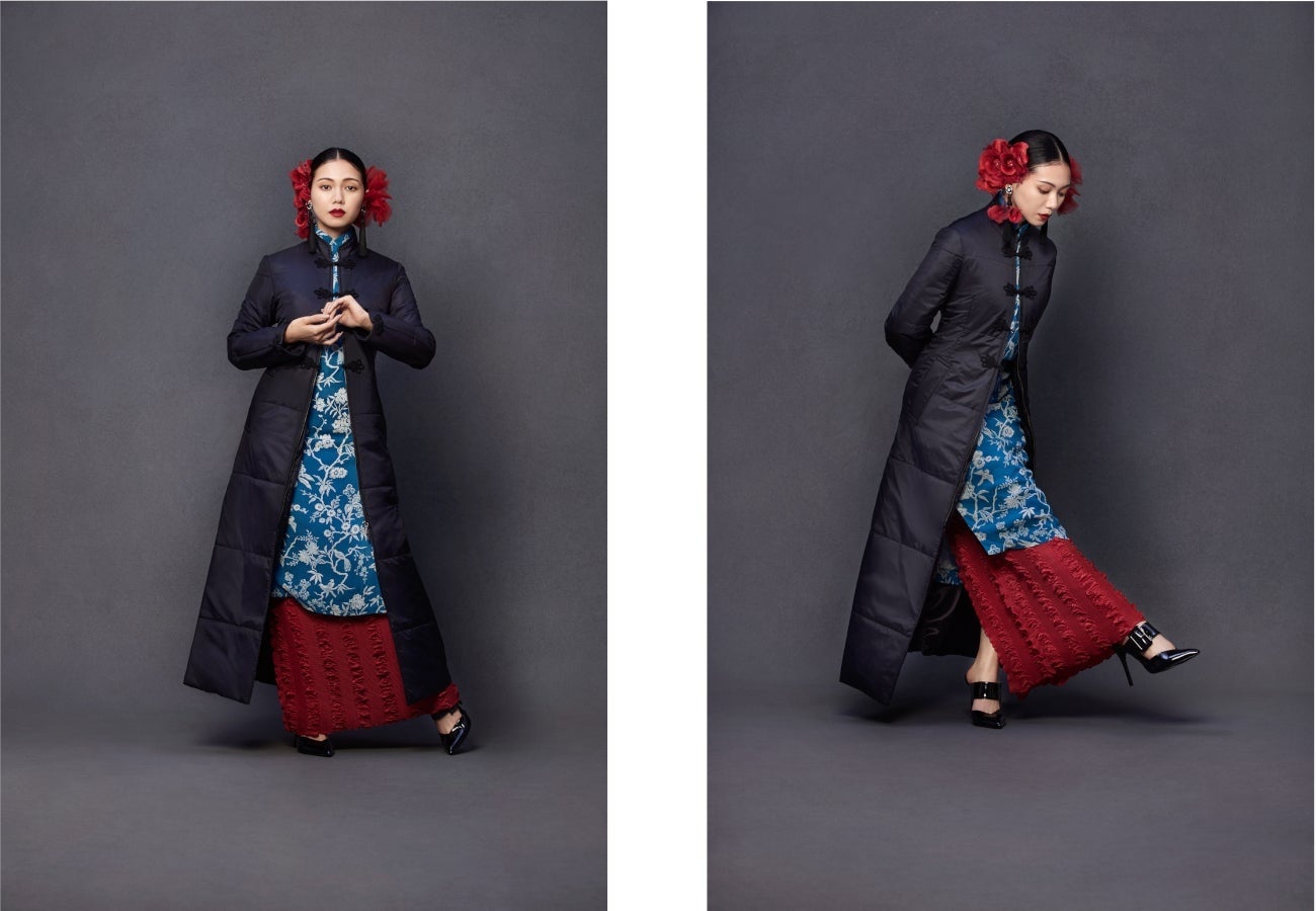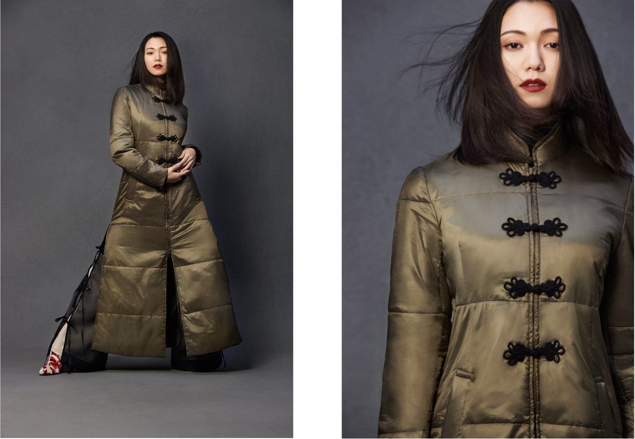 CHINA DRESSとキルティングコートをミックスしたデザインコート。大判のチャイナボタンを使用し、脇がスリットになっているのでパンツでもスカートでもスタイリングが楽しめる一着。表地には程よい光沢感と撥水機能があるリサイクルポリエステルのタフタ、中綿にはたった5mmでダウンの暖かさを持つ「Ethical Down Kapok®︎」を使用しています。