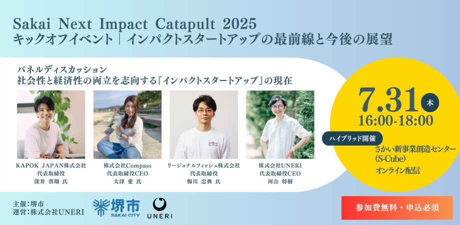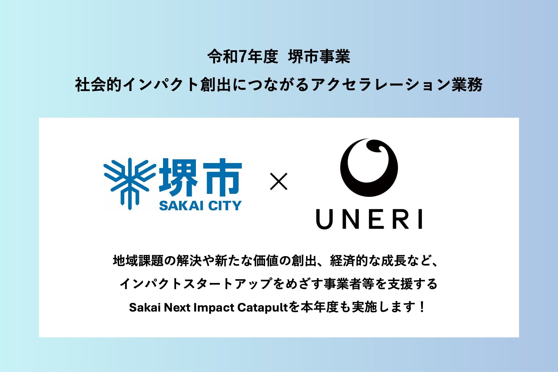 株式会社UNERI(本社:愛知県名古屋市、代表取締役CEO:河合将樹、以下「UNERI」)は、大阪府堺市から受託した「令和7年度社会的インパクト創出につながるアクセラレーション業務」にて、インパクトスタートアップをめざす事業者等向けの支援プログラム「Sakai Next Impact Catapult 2025(SNIC2025)」を始動、キックオフイベントの参加受付と、プログラム参加者の募集を開始しました。なお、UNERIが本事業を受託運営するのは、2024年度に続いて2年目となります。