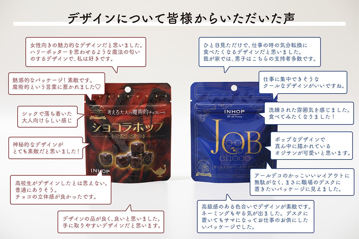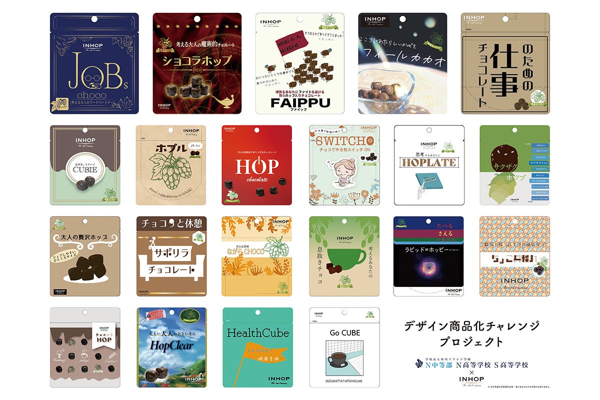 2021年夏に、角川ドワンゴ学園のN高等学校(N高)、S高等学校(S高)、N中等部*の体験型学習プログラムとして、「INHOPデザイン商品化チャレンジ」が行われました。商品パッケージのデザインプロセスを学び、自分たちでワークを行い、優れたデザイン作品があれば実際に商品として販売することを目指したプログラムです。参加を希望した生徒24名の作品の中から優秀作品が選出され、N高の零音[Rain]さんが制作した「ショコラホップ」とN中等部(2021年当時在籍)の本田利季さんが制作した「JOB CHOCO」は、特に優れた作品として最優秀賞に選ばれました。この2作品は、商品として販売出来るポテンシャルであるとINHOPは判断し、実際に販売商品にするために、2人にさらなるブラッシュアップをお願いして、パッケージが完成したのです。
