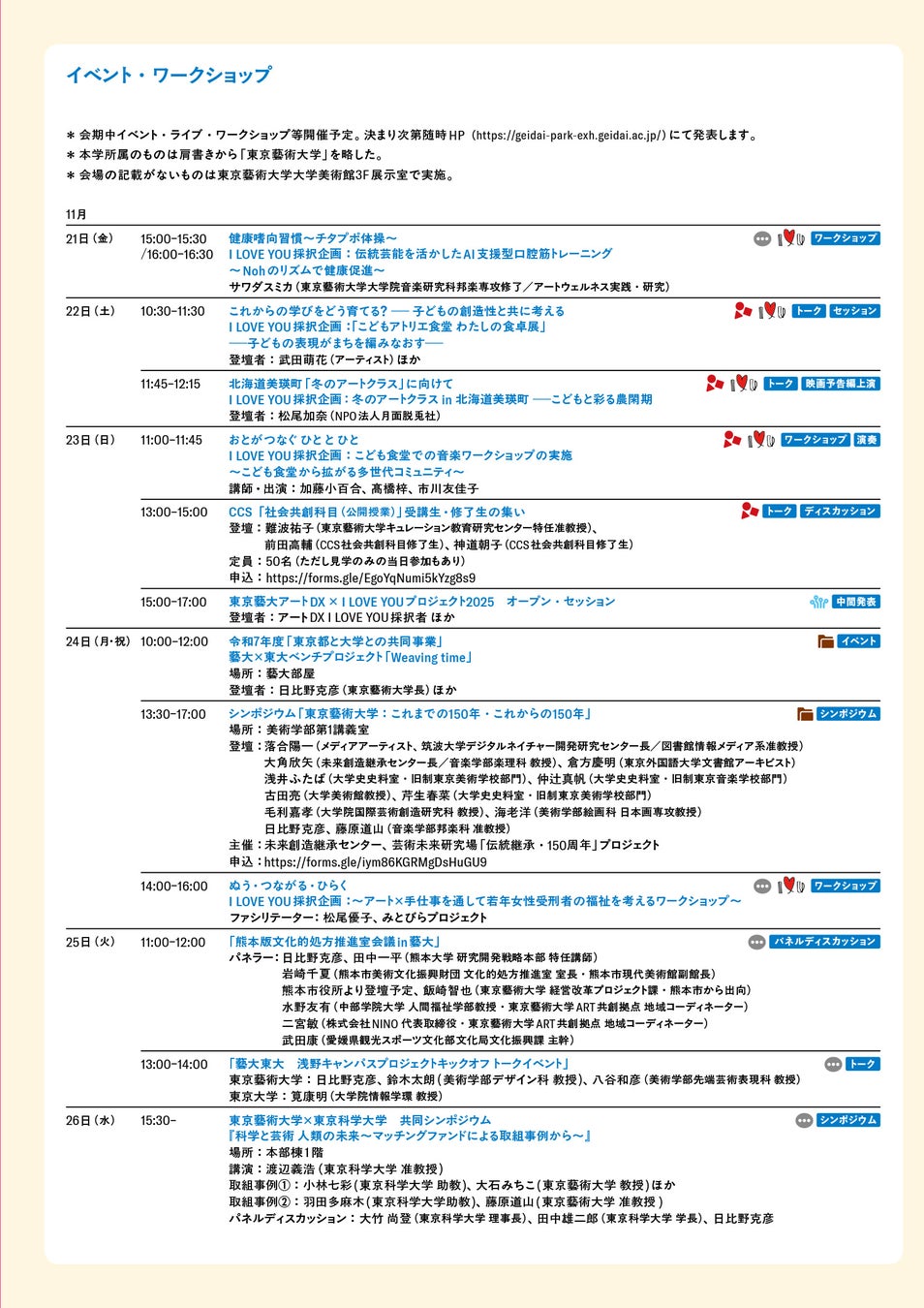 音楽学部第2ホール / 美術学部第1講義室 / 音楽学部5-109 / 藝大食楽部 他 |