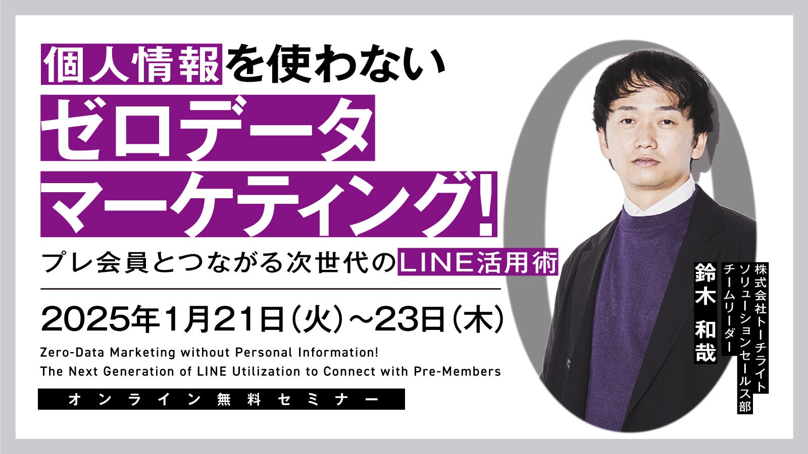 LINEコンサルティングサービス「TeLAS(テラス)」を展開している株式会社トーチライト(本社:東京都渋谷区、代表取締役社長:熊田 聡、以下 トーチライト)は、1月21日(火)から23日(木)の3日間限定で「個人情報を使わないゼロデータマーケティング!プレ会員とつながる次世代のLINE活用術」と題した無料オンラインセミナーを開催いたします。