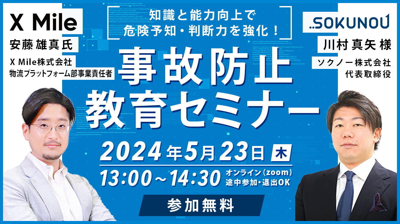 物流事業者向けSaaS・プラットフォーム「ロジポケ」を提供するX Mile株式会社(読み:クロスマイル、本社:東京都新宿区、代表取締役:野呂 寛之、以下「当社」)は、ソクノー株式会社(本社:東京都港区、代表取締役:川村 真矢、以下「ソクノー」)と共同で、物流業界向け「事故教育セミナー」を実施することをお知らせいたします。