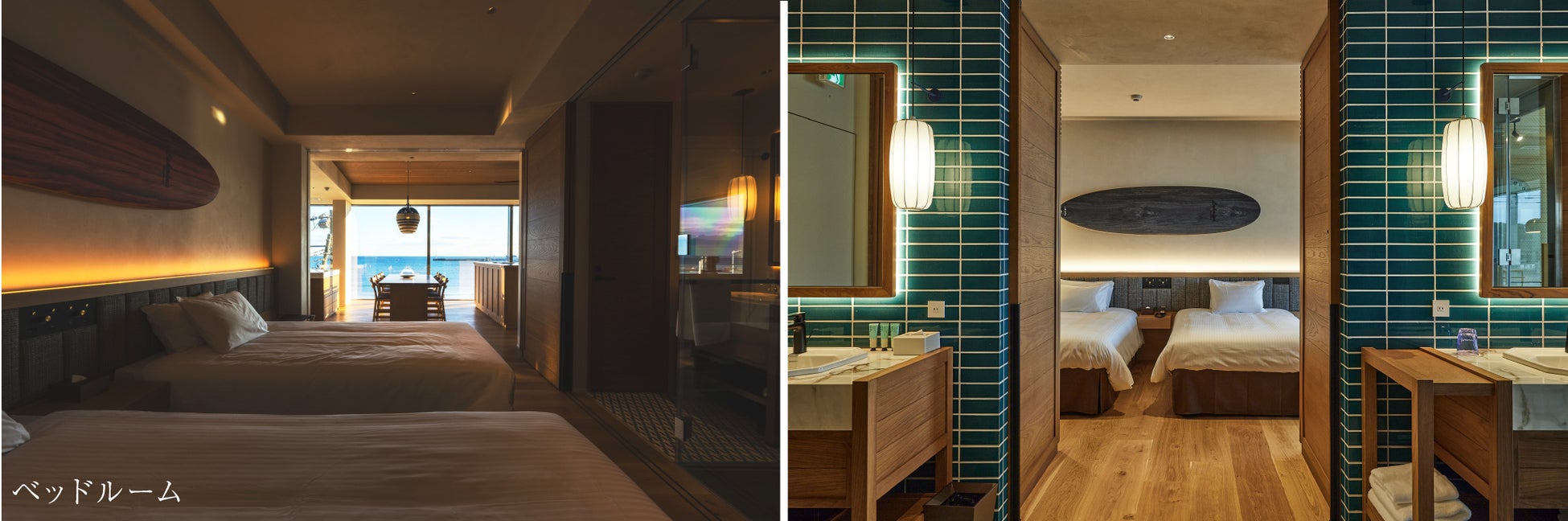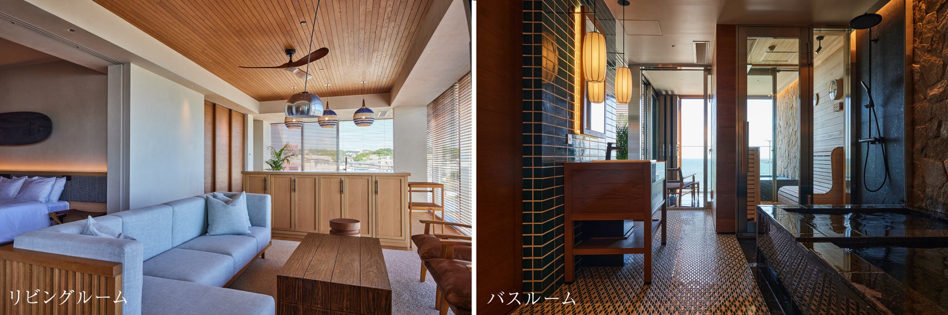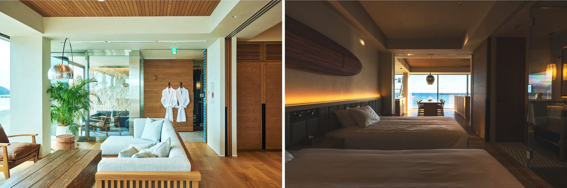 1日2組限定で、各フロア1室のみの特別な客室は、 130㎡超の2ベッドルームスイートで、ゆったりと余裕のある “間”を大切にしています。鎌倉の海を一面に望む贅沢で開放感あふれるリビングルームと露天風呂、サウナが備えられており、都会にある緊張感から解放される場所でありつつまるで自宅で過ごしているかのようなリラックスしたステイスタイルを叶えます。静かに暮れゆく夕日や波の音、満天の星空と共に、極上の安らぎの時間をお過ごしいただけます。