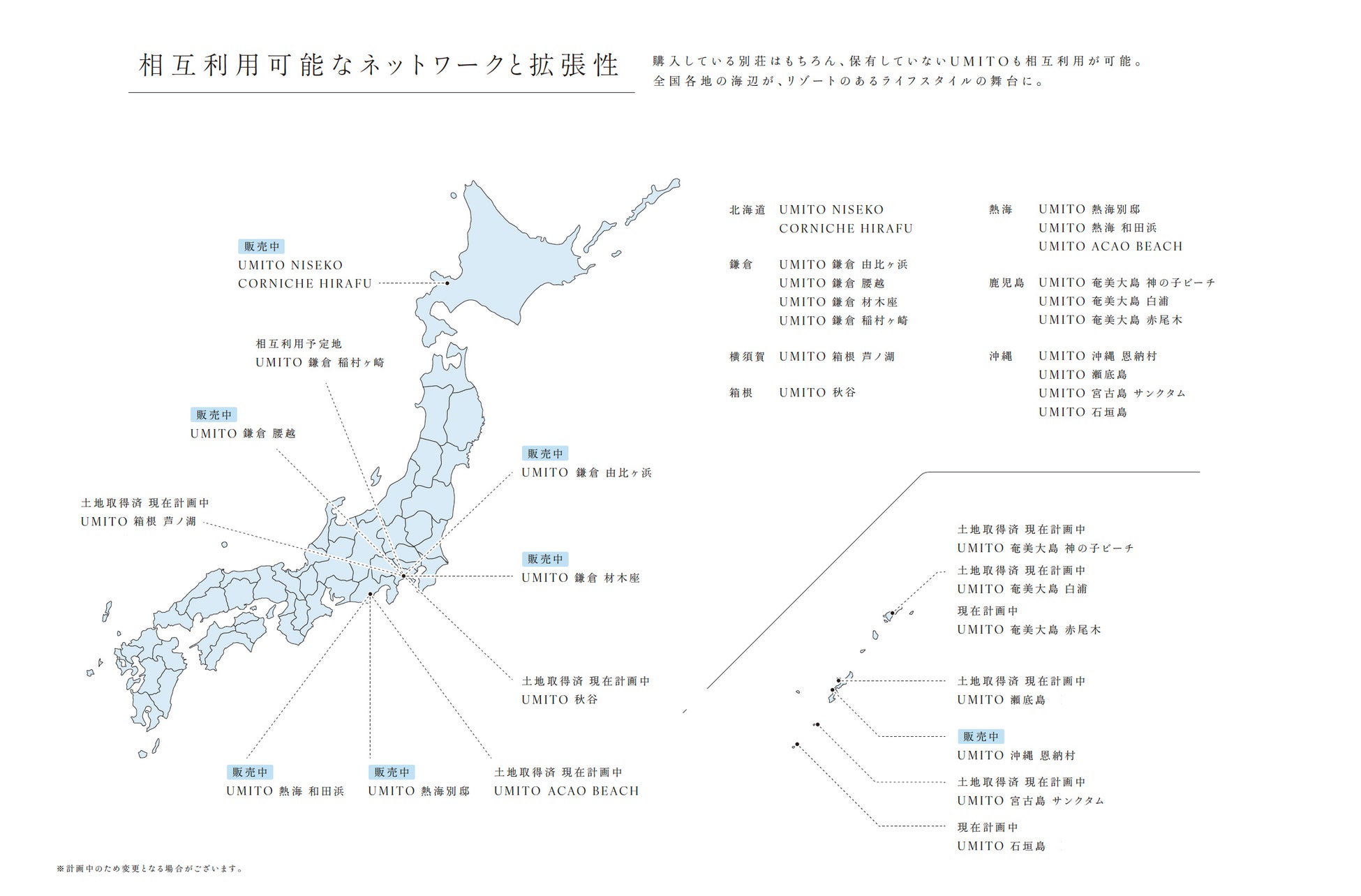 UMITO 沖縄 恩納村、UMITO 鎌倉 腰越、UMITO 鎌倉 材木座、UMITO 熱海 別邸、UMITO 熱海 和田浜といった、海を最前列で感じられるホテルにもなる別荘を続々と販売しています。