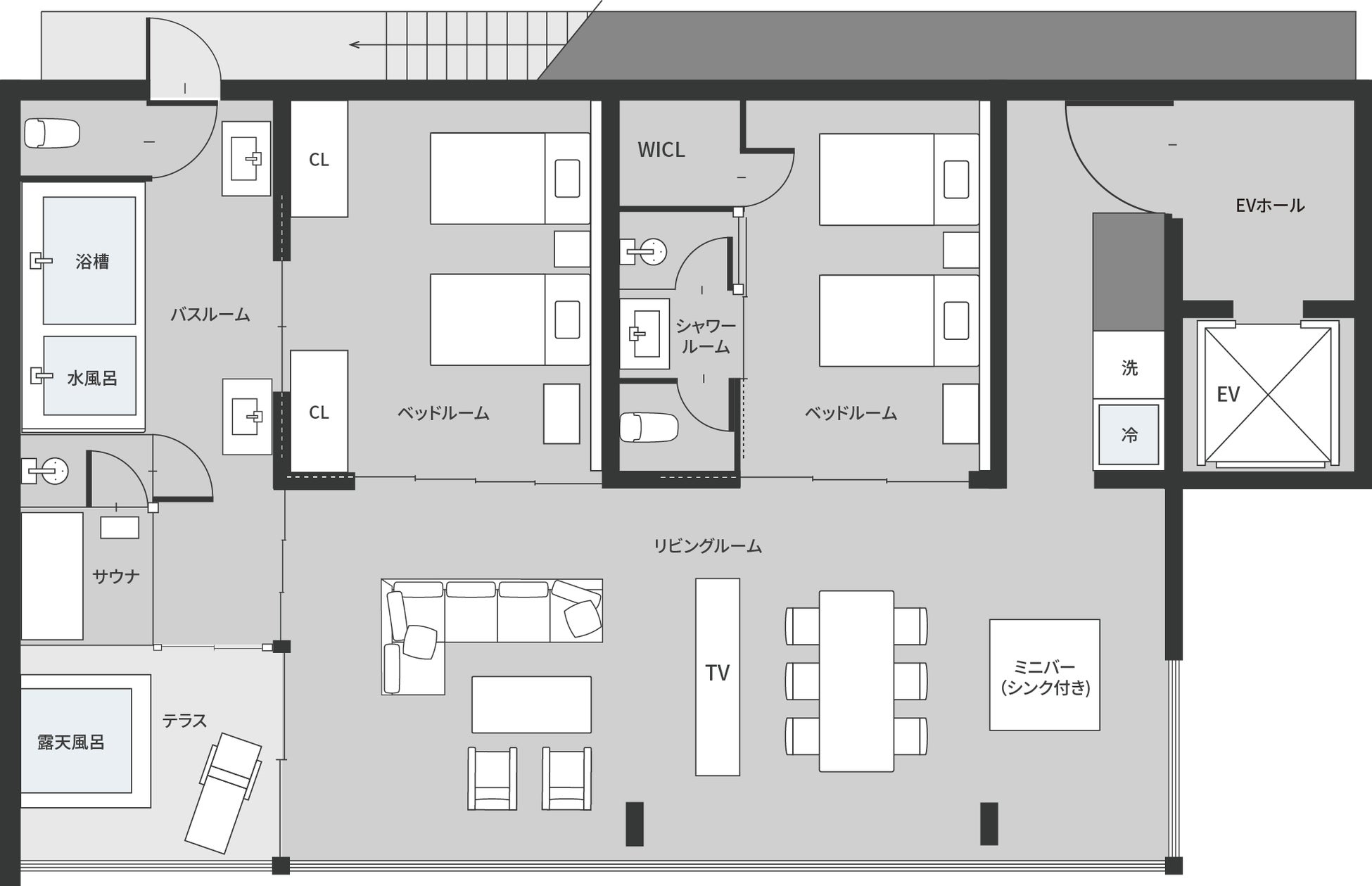 サウナ/水風呂/露天風呂付きテラス/シャワールーム/シモンズベッド/クローゼット/ダイニングテーブル/ダイニングチェア/ローテーブル/ソファ/テラスチェア/オットマン/サイドテーブル/50インチテレビ/冷凍冷蔵庫/電気ポット/電子レンジ/洗濯乾燥機/空気清浄機/ワイヤレススピーカー