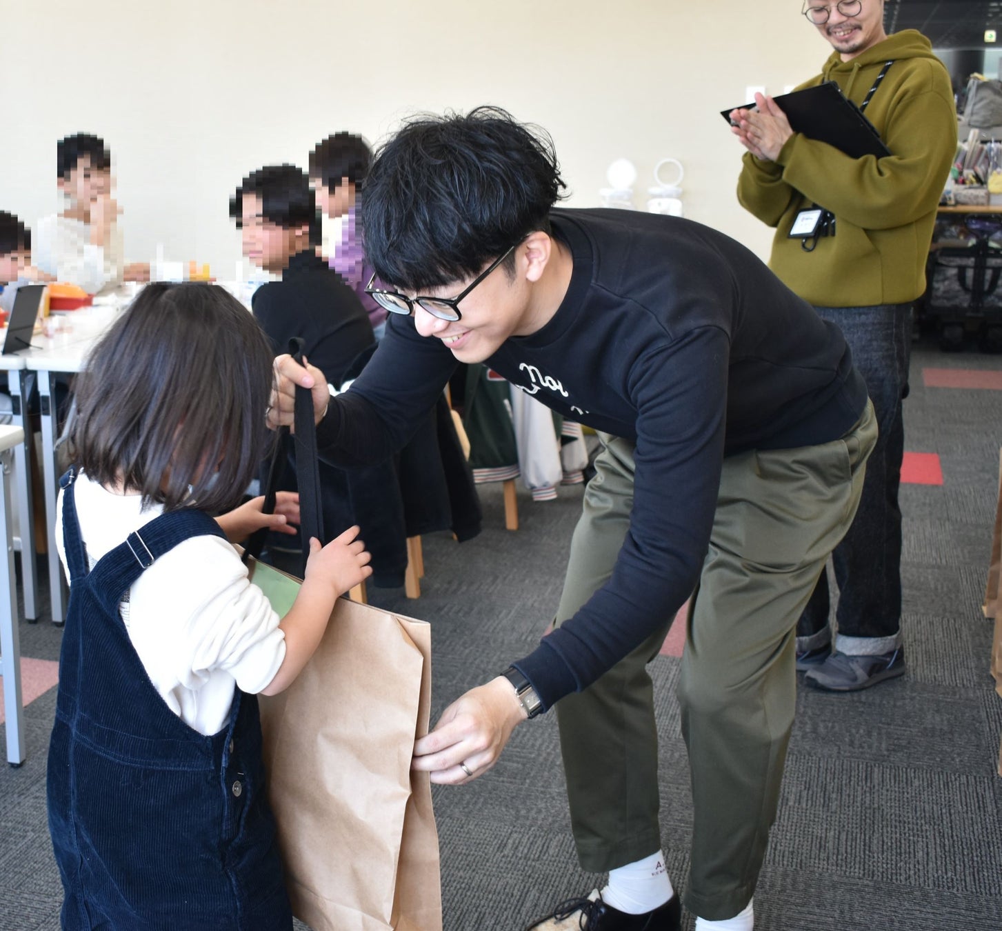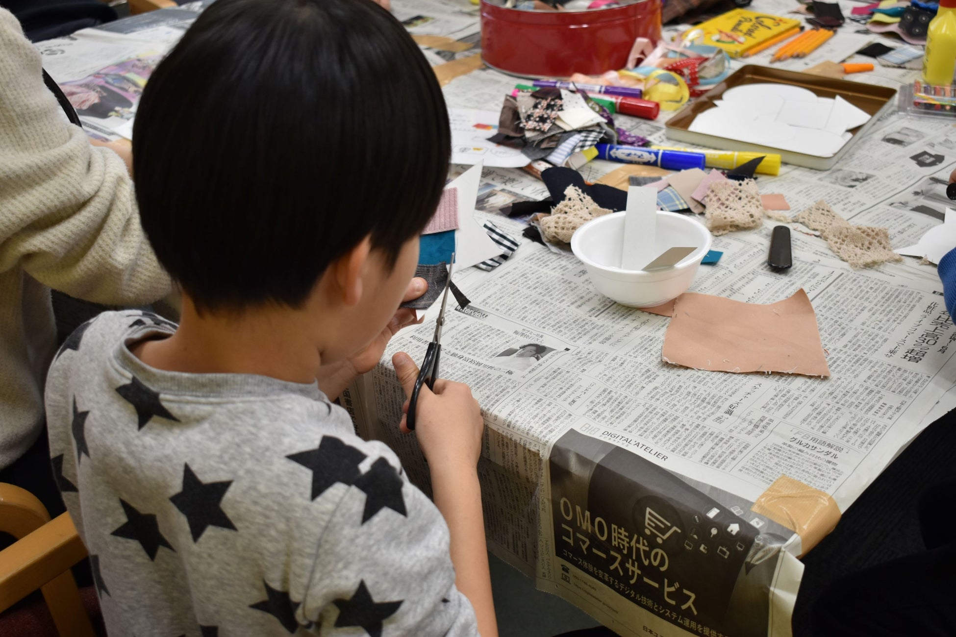 イベントの前半では、当社生地を使ったメッセージカード作りのワークショップを行い、子どもたちが思い思いの生地を選んで世界で1つだけの作品を作った後、当社がフランチャイジーとして展開するコメダ珈琲の軽食を囲んで門出の日をお祝いしました。最後に一人ひとりに当社製のフォーマル服が手渡されると、子どもたちに笑顔が広がりました。