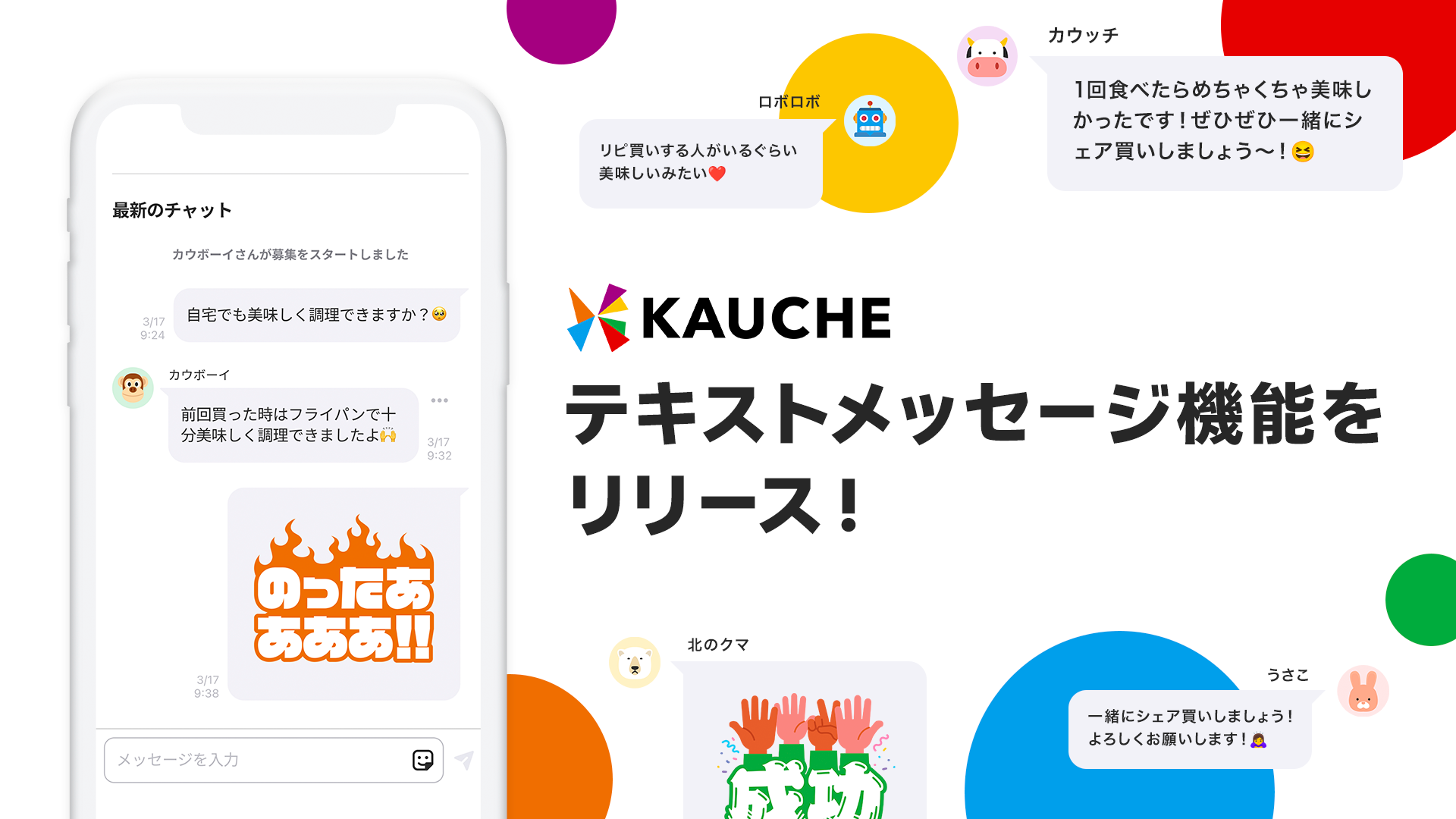 シェア買いアプリ「カウシェ」、シェア買い仲間募集時にお客様同士がチャットで自由な会話ができる「テキストメッセージ機能」をリリース