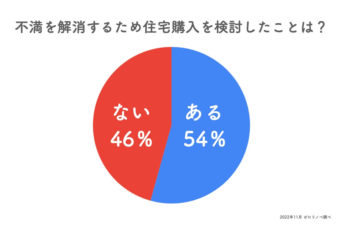■不満を解消するために「住宅購入を検討した」という人は54%