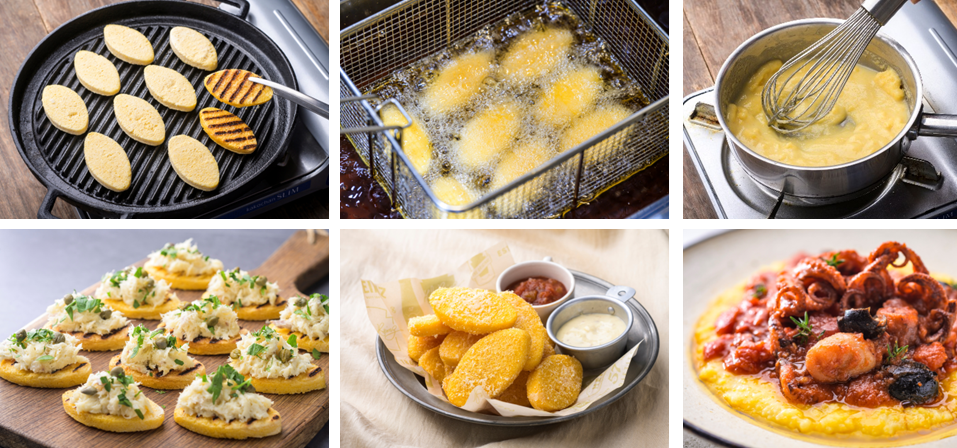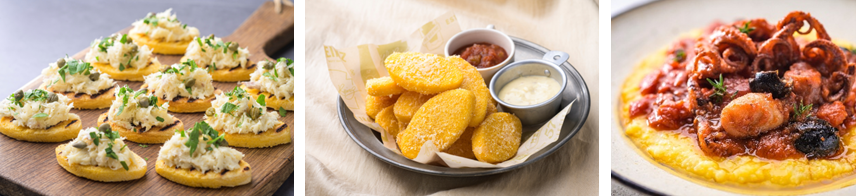 本来、弱火で約40分も練り続ける必要があるポレンタの調理工程を工場で完結し、厨房のオペレーションを大幅に簡略化することが可能となりました。現場ではフライパンやグリルで焼いて前菜やビュッフェメニューに使用したり、フライヤーで揚げてフィンガーフードにしたり、凍ったまま水を加えて5-6分加熱して伝統的な付け合わせにも使えるなど、本品だけで多彩なメニュー展開ができます。