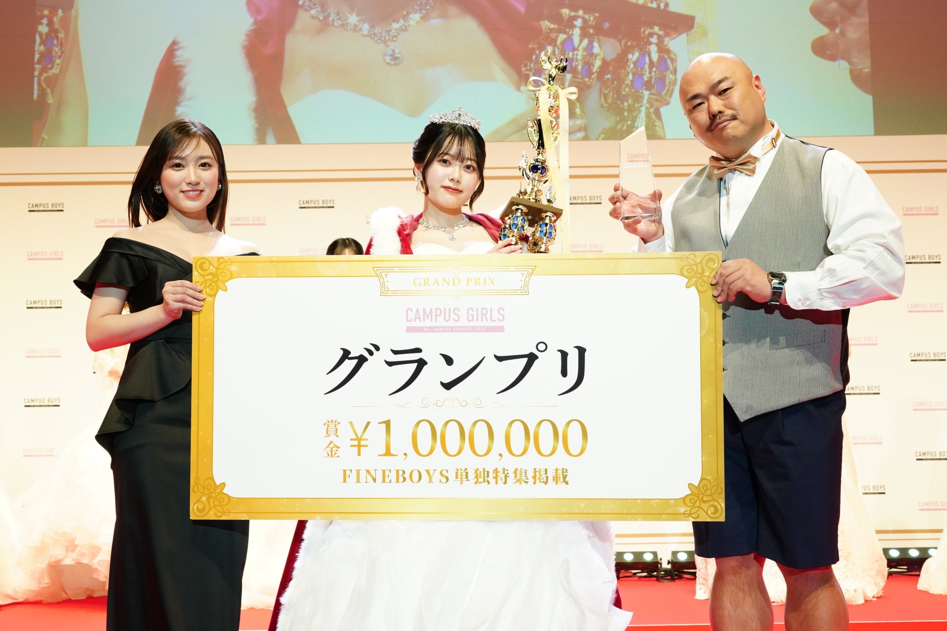 「CAMPUS GIRLS 2024」【グランプリ】に山田瑠々さんが選ばれ、ガウンとティアラ、トロフィー、クリスタルが授与されました。山田瑠々さんは【NEXT STAR賞】【ミクチャ賞】にも選ばれ3冠受賞となりました。「グランプリという座をとらせていただき、本当にありがとうございます。ファンの方々、応援してくれた方々、家族、友達、みんなに支えられて半年間ここまで頑張ってくることができました。1人では絶対見られることができなかったグランプリからの景色、見させてくれてありがとうございます。今、めちゃめちゃ幸せです!」と受賞の喜びを噛み締めながら笑顔で語りました。グランプリには、賞金100万円、そして副賞として「FINEBOYS単独特集 見開一面掲載権」が贈られました。
