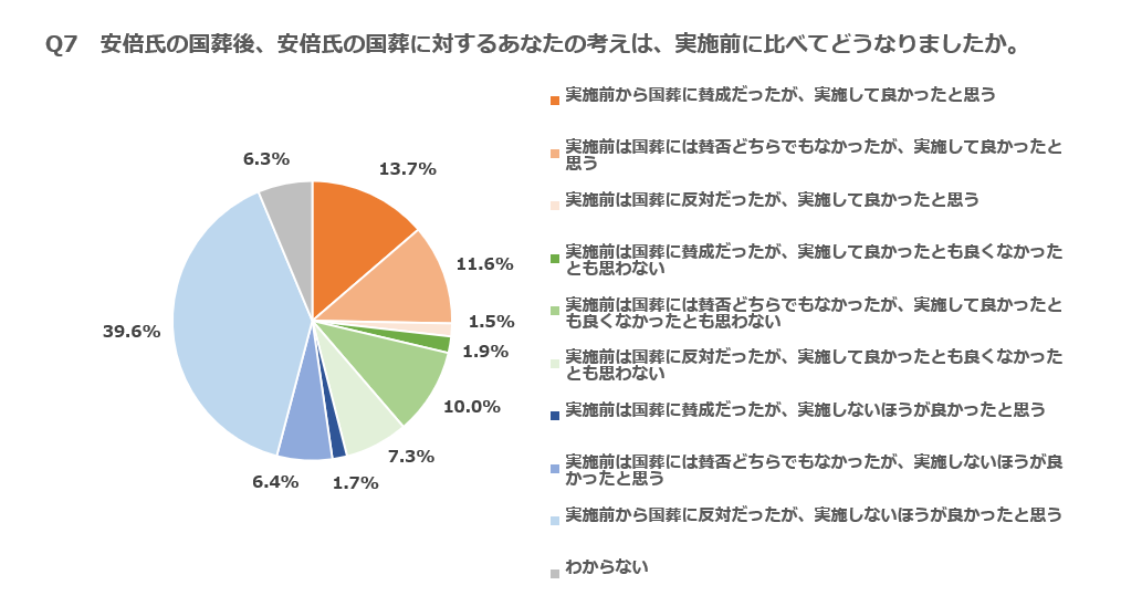- 安倍氏の国葬実施前は「反対」「賛否どちらでもない」だった人のうち、国葬後に「実施して良かった」とした人は計13.1%だった。これに対し、実施前は「賛成」「賛否どちらでもない」だった人のうち、国葬後に「実施しないほうが良かった」と思った人は計8.3%だった。(Q7)