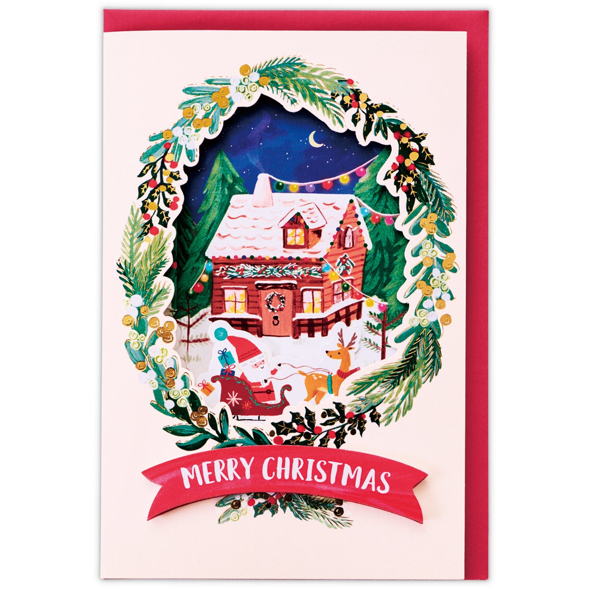 大きくくり抜かれたリース型の窓から、そりに乗ったサンタクロースや森の中のおうちが見える心温まるデザイン。カジュアルでありながら上品さも感じられるデザインは、大人同士の贈り物にもぴったりです。