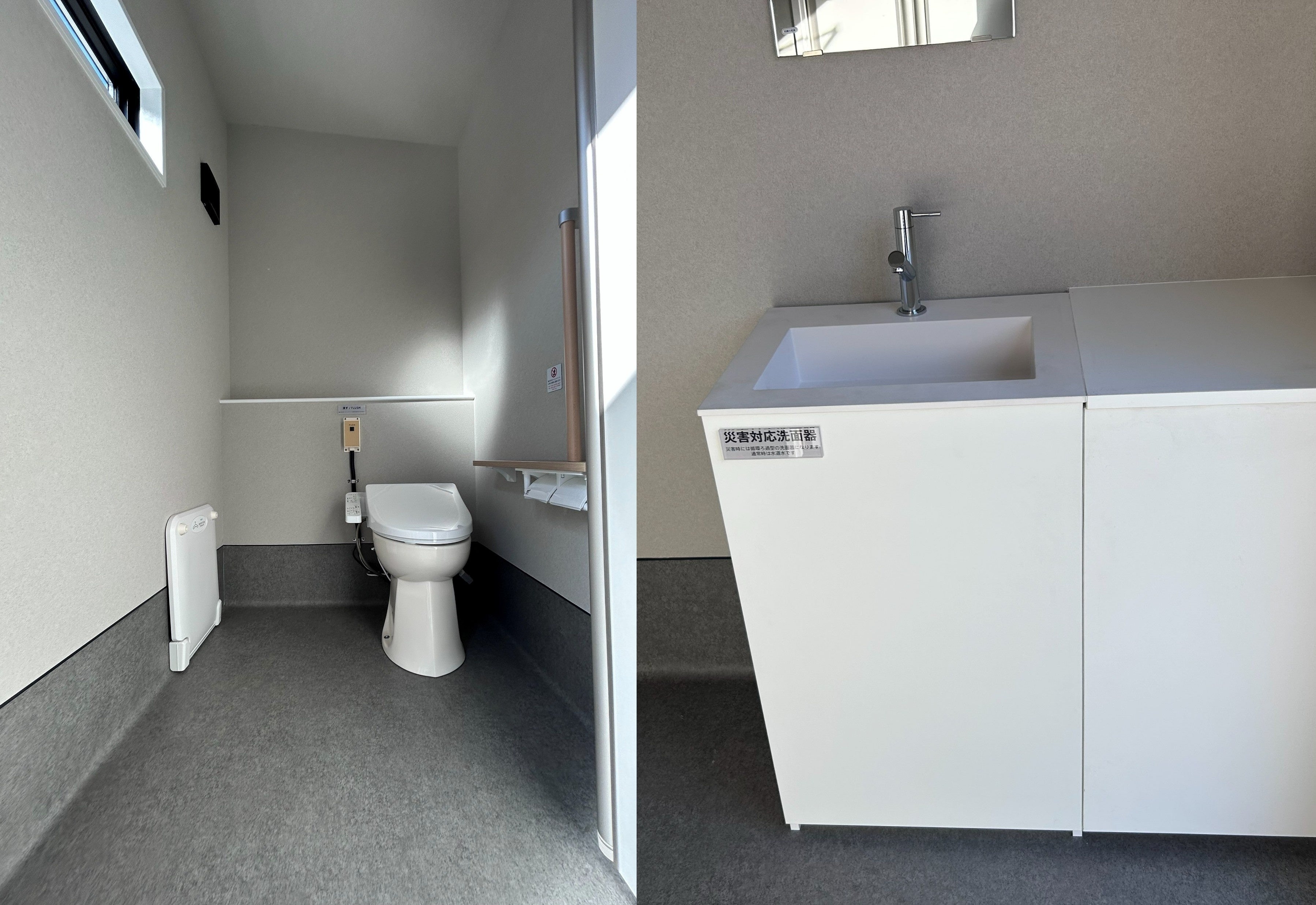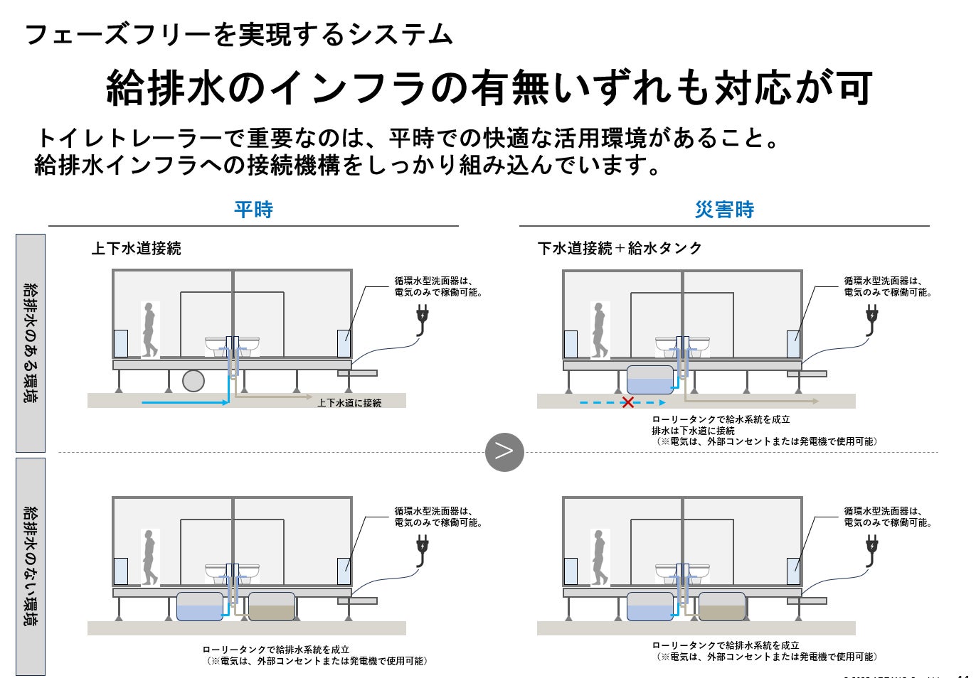 平常時は上下水道に接続して常設トイレとして利用し、災害時には簡易に給排水タンクの利用へと切り替えが可能です。