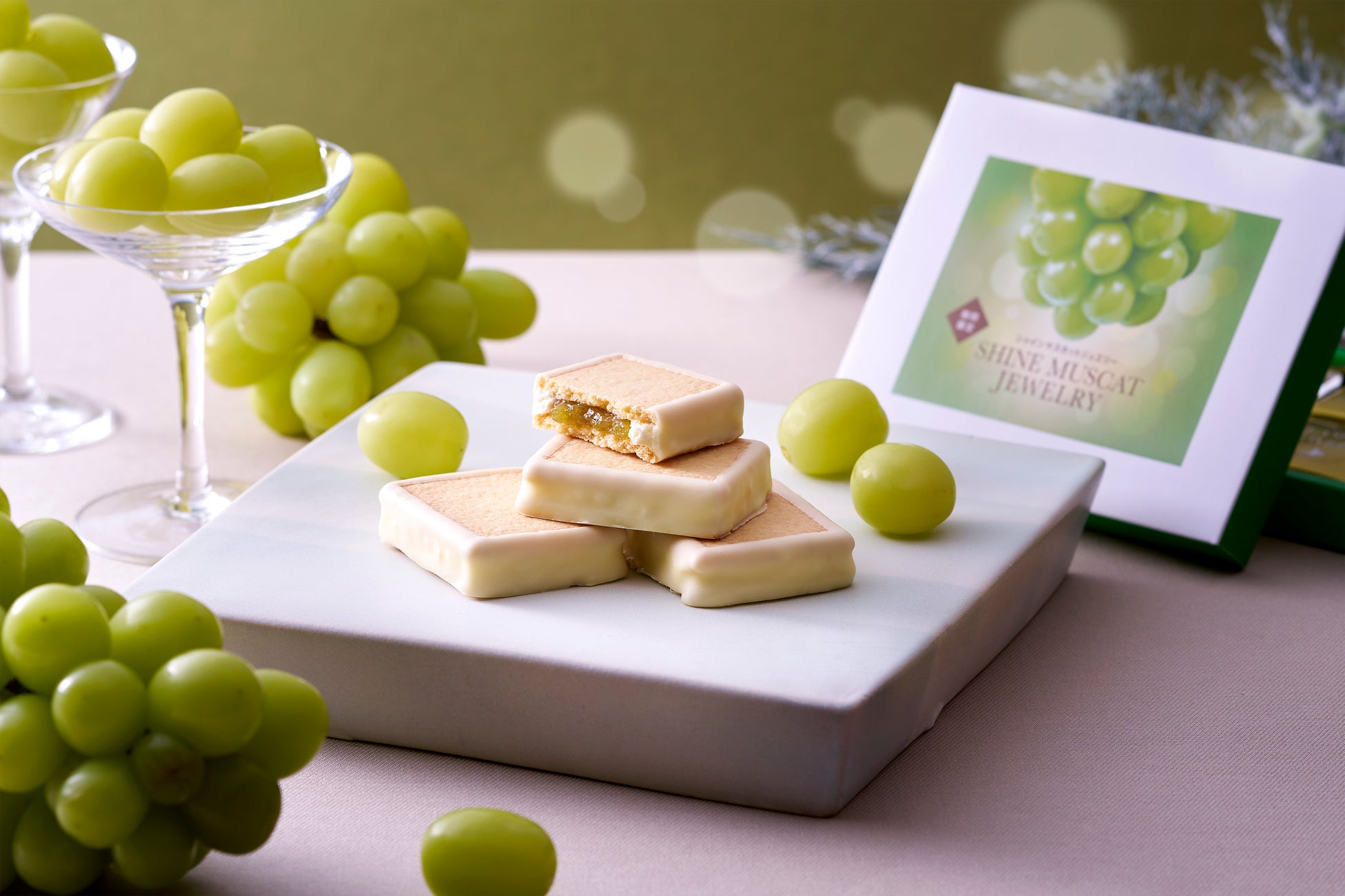 鮮やかな緑が美しい宝石のような果実、仁木町産「シャインマスカット」。糖度が高く大きく美しい実がなるよう、ひと房ずつ丁寧に手入れされ生産者様の愛情が込められてようやく収穫されます。すべての房に手間をかけて大切に生育されますが、一部、どうしても基準に準じない房も出てしまう中で、スイーツにすることで希少な果実を余すことなく全国のお客様にお届けするため、「シャインマスカットジュエリー」を新発売いたします。