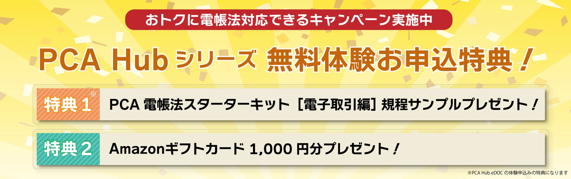 『PCAクラウド』や『PCAサブスク』をはじめとするサブスクリプション型基幹業務システムを開発・販売するピー・シー・エー株式会社(代表取締役社長:佐藤文昭 本社:東京都千代田区 プライム銘柄コード9629 以下:PCA)は、2024年1月から電子帳簿保存法(電子取引)が“完全“義務化されることから、証憑電子保管サービス(電子帳簿保存法対応)である『PCA Hub eDOC』の新規体験利用をお申込みいただいた法人様に『PCA電帳法スターターキット[電子取引]規程サンプル』を特別に無料ダウンロード・無料視聴いただけるとともに、Amazonギフトカード1,000円相当をプレゼントいたします『おトクに電帳法対応できるキャンペーン』を開始しましたことをお知らせします。