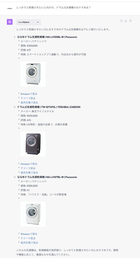 ▶️質問例:「しっかりと乾燥させたい人向けの、ドラム式洗濯機のおすすめは?」と質問した場合